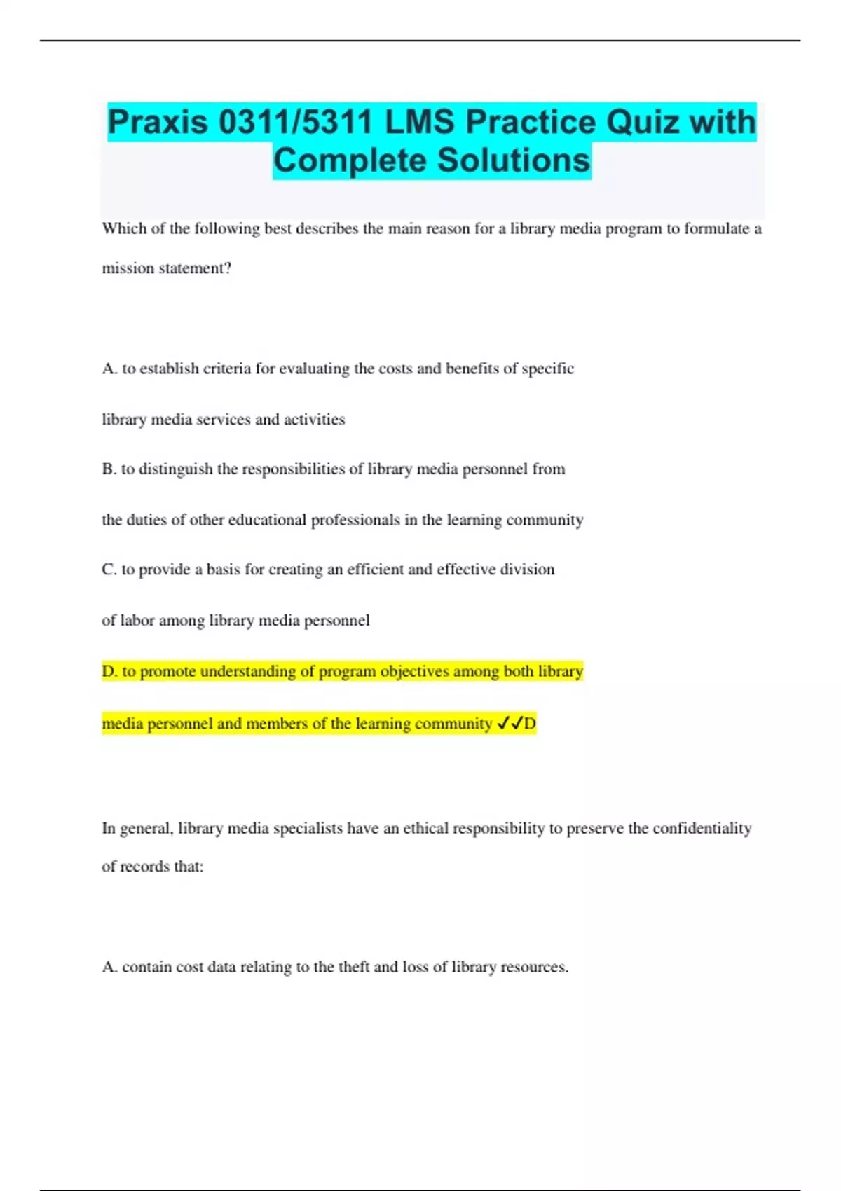 Praxis 0311/5311 LMS Practice Quiz with Complete Solutions Which of the following best describes the main reason for a library media program to formulate a mission statement? A. to establish criteria for evaluating the costs and benefits of specific library media services and activities B. to distinguish the responsibilities of library media personnel from the duties of other educational professionals in the learning community C. to provide a basis for creating an efficient and effective division of labor among library media personnel D. to promote understanding of program objectives among both library media personnel and members of the learning community D In general, library media specialists have an ethical responsibility to preserve the confidentiality of records that: A. contain cost data relating to the theft and loss of library resources. B. link specific individuals with specific library resources. C. reveal the frequency with which a specific library resource is used. D. connect specific school courses with specific library resources B Search strategies to locate information for research projects are likely to be most successful when students make an effort before starting their searches to: A. estimate the length of time needed to complete their investigation. B. select an appropriate format for communicating the information they expect to find. C. create a list of key terms and related ideas. D. anticipate problems that will require them to adjust their search strategies. C Teaching students to look for words such as "apparently" and "likely" when reading for information is most likely to promote their ability to: A. recognize conclusions stated by the author. B. distinguish the author's judgments from confirmed facts. C. make inferences about what the author wants them to understand. D. identify an author's use of faulty reasoning. B A student is having trouble locating pertinent information for a social studies research project. For the past week, the student has spent one hour per day looking through several sources without finding much useful information. The student has asked the library media specialist for help in deciding how to proceed. The library media specialist should suggest that the student make which of the following adjustments to the search strategy first? A. devoting at least another hour each day to research B. reassessing the original topic or thesis C. revising the preliminary outline for the project D. rereading carefully the sources the student has already examined B A library media specialist wants to align the program goals for the library media center with the curricular needs of the school. To facilitate this process, which of the following steps should the library media specialist take first? A. Discuss discrepancies between the curriculum goals and available resources with library media center staff. B. Obtain input from the principal about objectives and planning for the library media center. C. Discuss instructional and research needs with teachers and