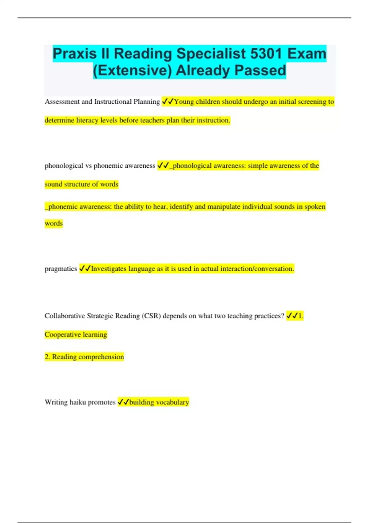 Praxis II Reading Specialist 5301 Exam (Extensive) Already Passed