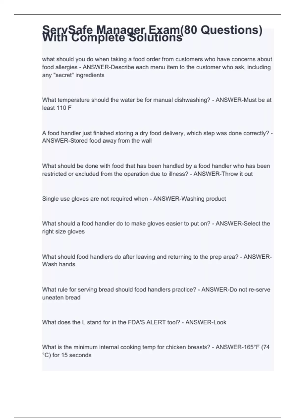 what should you do when taking a food order from customers who have concerns about food allergies - ANSWER-Describe each menu item to the customer who ask, including any "secret" ingredients What temperature should the water be for manual dishwashing? - ANSWER-Must be at least 110 F A food handler just finished storing a dry food delivery, which step was done correctly? - ANSWER-Stored food away from the wall What should be done with food that has been handled by a food handler who has been restricted or excluded from the operation due to illness? - ANSWER-Throw it out Single use gloves are not required when - ANSWER-Washing product What should a food handler do to make gloves easier to put on? - ANSWER-Select the right size gloves What should food handlers do after leaving and returning to the prep area? - ANSWER-Wash hands What rule for serving bread should food handlers practice? - ANSWER-Do not re-serve uneaten bread What does the L stand for in the FDA'S ALERT tool? - ANSWER-Look What is the minimum internal cooking temp for chicken breasts? - ANSWER-165°F (74 °C) for 15 seconds