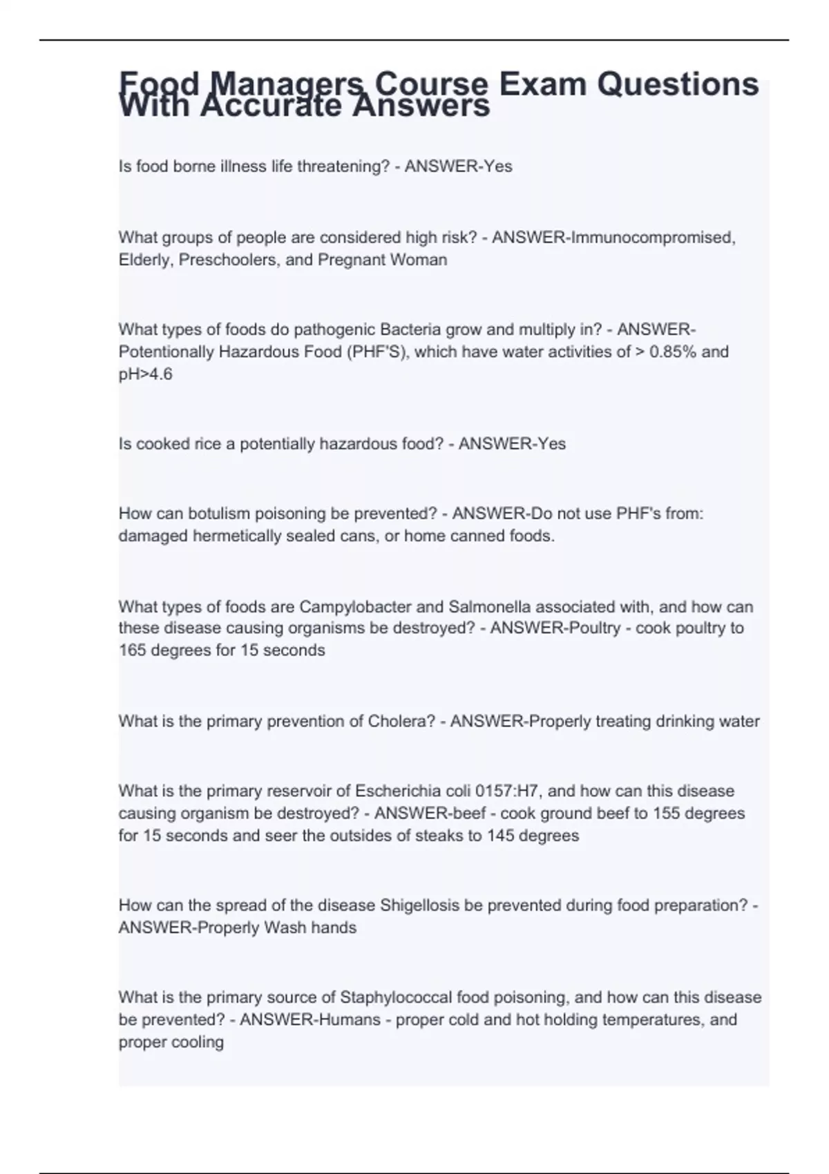 Food Managers Course Exam Questions With Accurate Answers
