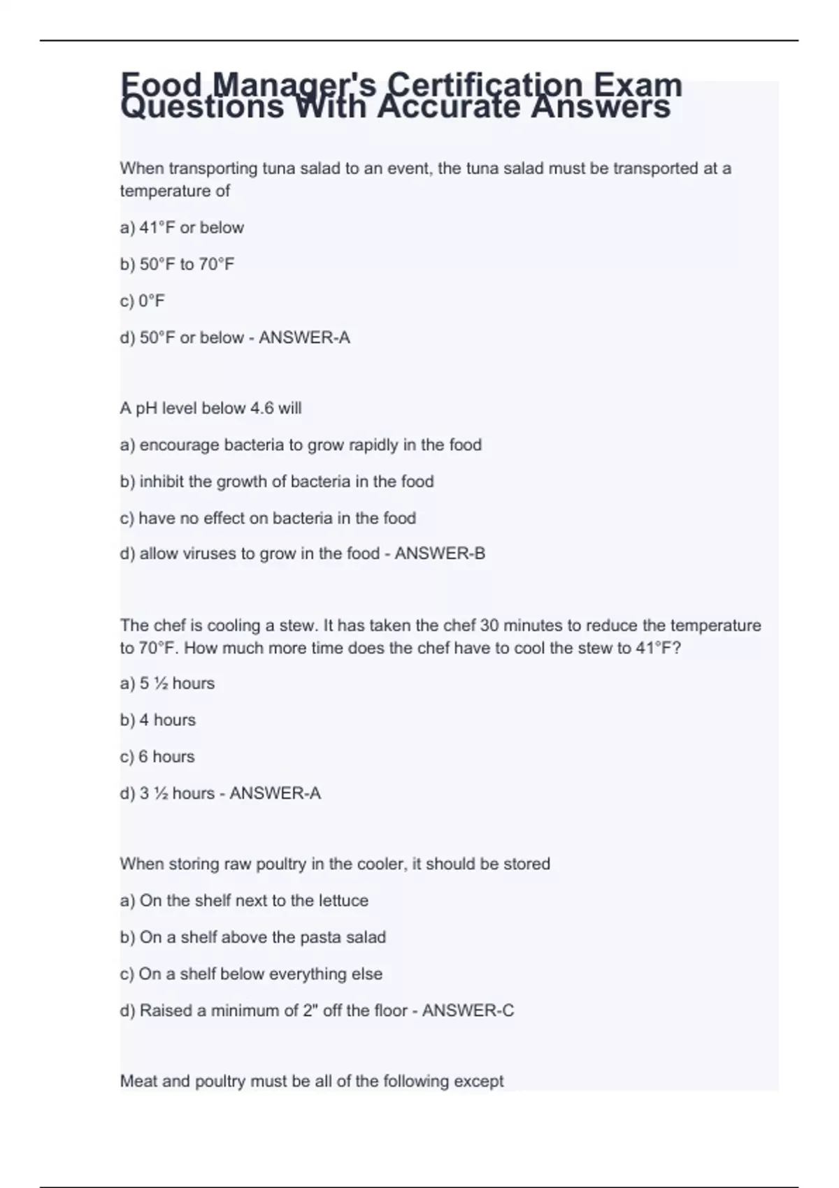When transporting tuna salad to an event, the tuna salad must be transported at a temperature of a) 41°F or below b) 50°F to 70°F c) 0°F d) 50°F or below - ANSWER-A A pH level below 4.6 will a) encourage bacteria to grow rapidly in the food b) inhibit the growth of bacteria in the food c) have no effect on bacteria in the food d) allow viruses to grow in the food - ANSWER-B The chef is cooling a stew. It has taken the chef 30 minutes to reduce the temperature to 70°F. How much more time does the chef have to cool the stew to 41°F? a) 5 ½ hours b) 4 hours c) 6 hours d) 3 ½ hours - ANSWER-A When storing raw poultry in the cooler, it should be stored a) On the shelf next to the lettuce b) On a shelf above the pasta salad c) On a shelf below everything else d) Raised a minimum of 2" off the floor - ANSWER-C