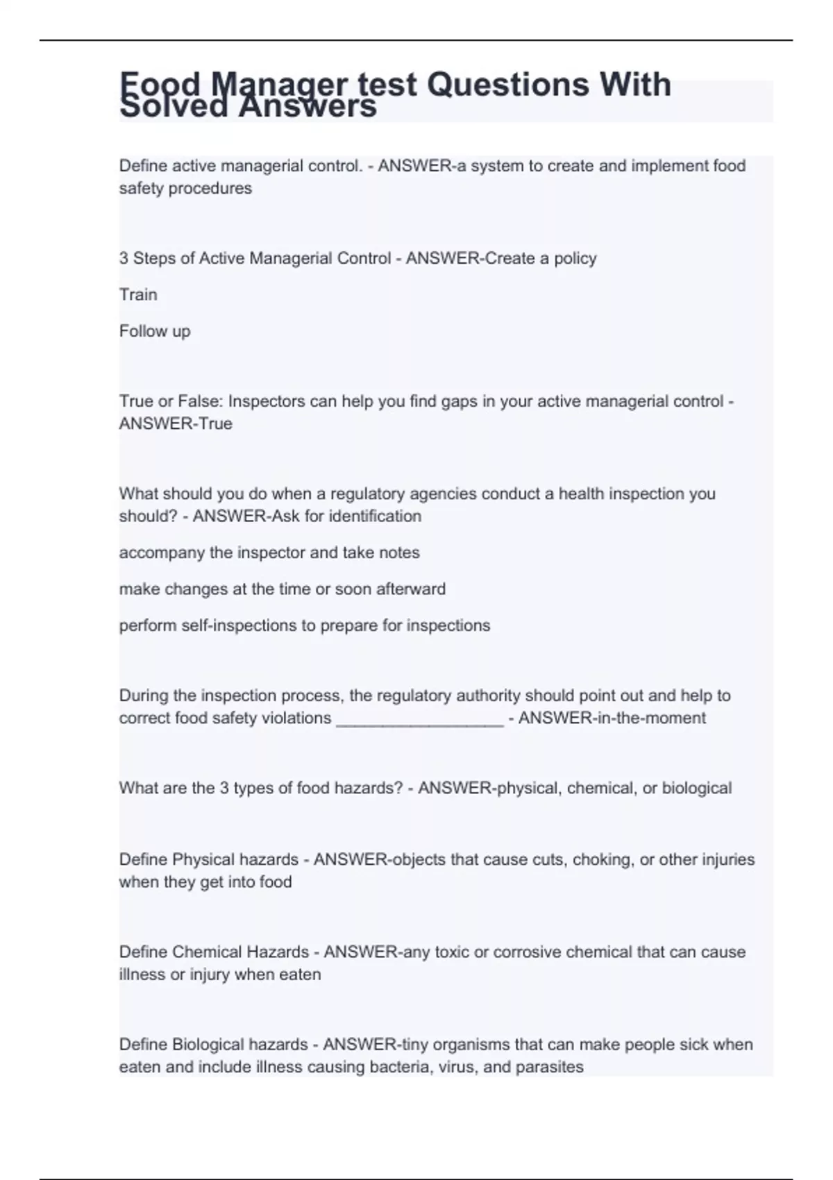 Define active managerial control. - ANSWER-a system to create and implement food safety procedures 3 Steps of Active Managerial Control - ANSWER-Create a policy Train Follow up True or False: Inspectors can help you find gaps in your active managerial control - ANSWER-True What should you do when a regulatory agencies conduct a health inspection you should? - ANSWER-Ask for identification accompany the inspector and take notes make changes at the time or soon afterward perform self-inspections to prepare for inspections During the inspection process, the regulatory authority should point out and help to correct food safety violations __________________ - ANSWER-in-the-moment What are the 3 types of food hazards? - ANSWER-physical, chemical, or biological Define Physical hazards - ANSWER-objects that cause cuts, choking, or other injuries when they get into food Define Chemical Hazards - ANSWER-any toxic or corrosive chemical that can cause illness or injury when eaten