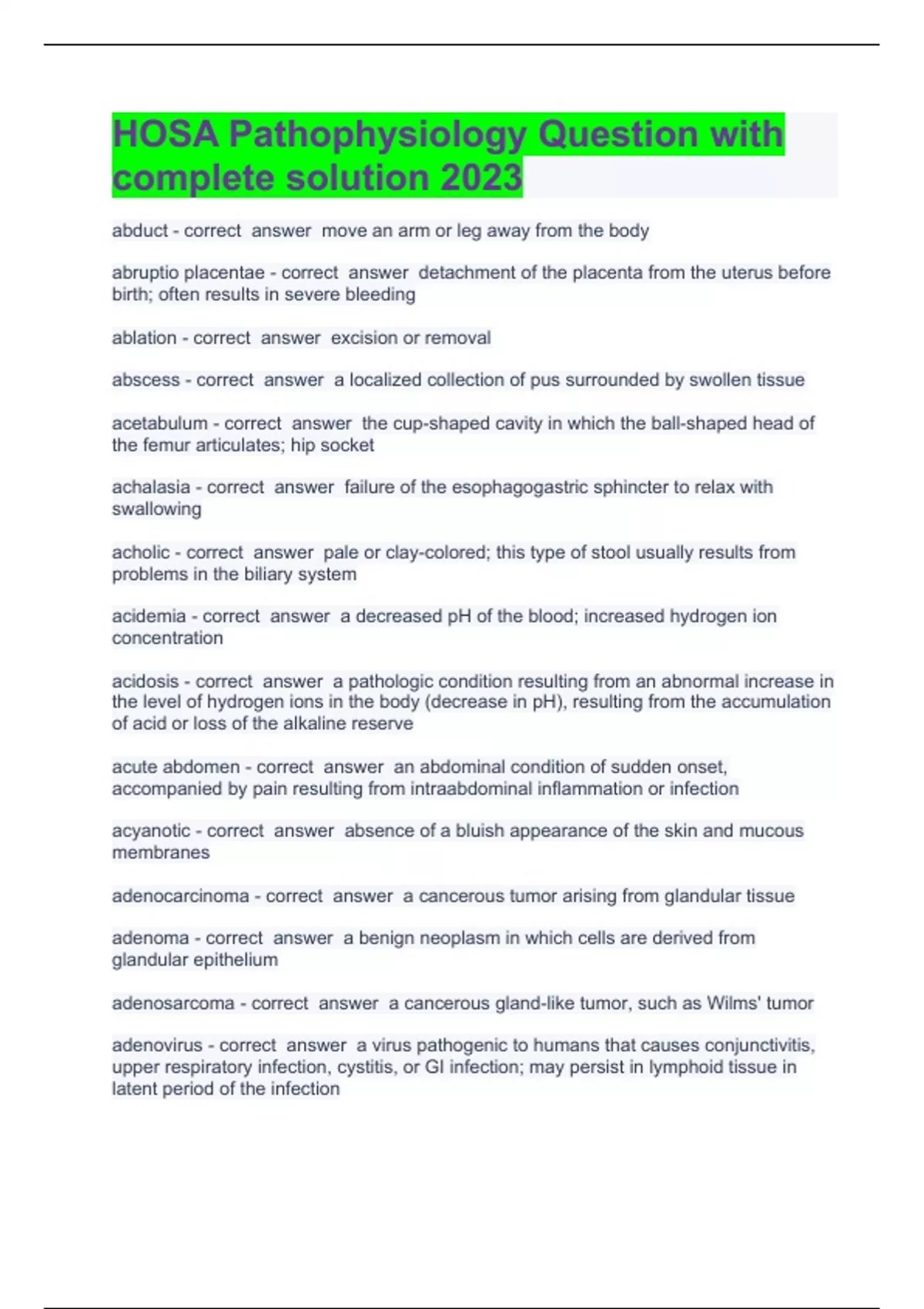 HOSA Pathophysiology Question with complete solution 2023(updated)HOSA Pathophysiology Question with complete solution 2023 abduct - correct answer move an arm or leg away from the body abruptio placentae - correct answer detachment of the placenta from the uterus before birth; often results in severe bleeding ablation - correct answer excision or removal abscess - correct answer a localized collection of pus surrounded by swollen tissue acetabulum - correct answer the cup-shaped cavity in which the ball-shaped head of the femur articulates; hip socket achalasia - correct answer failure of the esophagogastric sphincter to relax with swallowing acholic - correct answer pale or clay-colored; this type of stool usually results from problems in the biliary system acidemia - correct answer a decreased pH of the blood; increased hydrogen ion concentration acidosis - correct answer a pathologic condition resulting from an abnormal increase in the level of hydrogen ions in the body (decrease in pH), resulting from the accumulation of acid or loss of the alkaline reserve acute abdomen - correct answer an abdominal condition of sudden onset, accompanied by pain resulting from intraabdominal inflammation or infection acyanotic - correct answer absence of a bluish appearance of the skin and mucous membranes adenocarcinoma - correct answer a cancerous tumor arising from glandular tissue adenoma - correct answer a benign neoplasm in which cells are derived from glandular epithelium adenosarcoma - correct answer a cancerous gland-like tumor, such as Wilms' tumor adenovirus - correct answer a virus pathogenic to humans that causes conjunctivitis, upper respiratory infecti