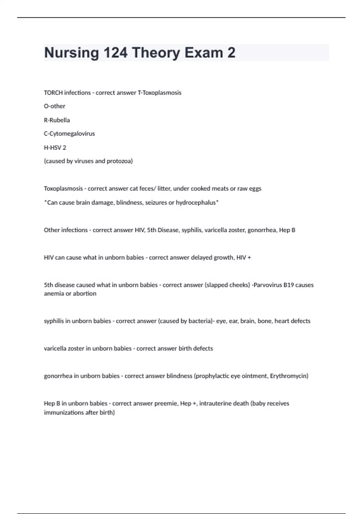 Nursing 124 Theory Exam 2TORCH infections - correct answer T-Toxoplasmosis O-other R-Rubella C-Cytomegalovirus H-HSV 2 (caused by viruses and protozoa) Toxoplasmosis - correct answer cat feces/ litter, under cooked meats or raw eggs *Can cause brain damage, blindness, seizures or hydrocephalus* Other infections - correct answer HIV, 5th Disease, syphilis, varicella zoster, gonorrhea, Hep B HIV can cause what in unborn babies - correct answer delayed growth, HIV + 5th disease caused what in unborn babies - correct answer (slapped cheeks) -Parvovirus B19 causes anemia or abortion syphilis in unborn babies - correct answer (caused by bacteria)- eye, ear, brain, bone, heart defects varicella zoster in unborn babies - correct answer birth defects gonorrhea in unborn babies - correct answer blindness (prophylactic eye ointment, Erythromycin) Hep B in unborn babies - correct answer preemie, Hep +, intrauterine death (baby receives immunizations after birth)