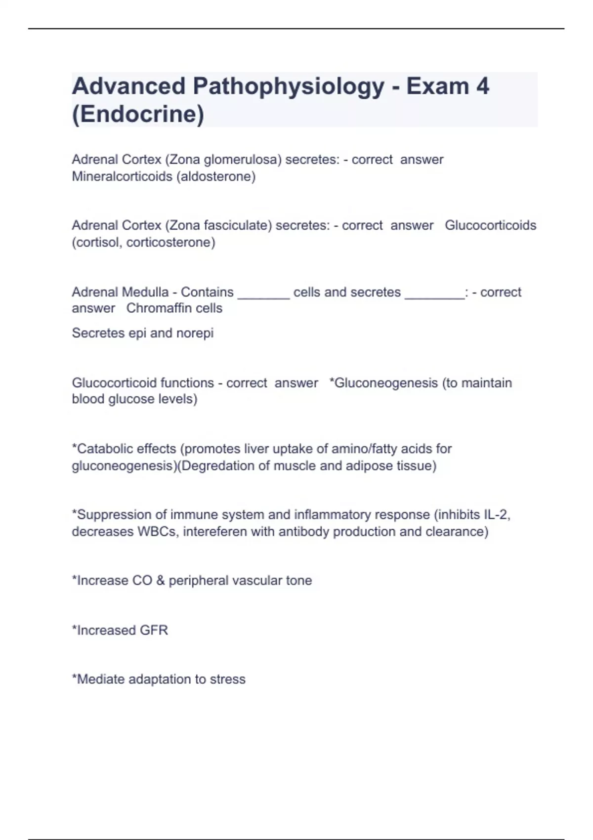 Advanced Pathophysiology Questions with complete solution 2024Advanced Pathophysiology - Exam 4 (Endocrine) Adrenal Cortex (Zona glomerulosa) secretes: - correct answer Mineralcorticoids (aldosterone) Adrenal Cortex (Zona fasciculate) secretes: - correct answer Glucocorticoids (cortisol, corticosterone) Adrenal Medulla - Contains _______ cells and secretes ________: - correct answer Chromaffin cells Secretes epi and norepi Glucocorticoid functions - correct answer *Gluconeogenesis (to maintain blood glucose levels) *Catabolic effects (promotes liver uptake of amino/fatty acids for gluconeogenesis)(Degredat