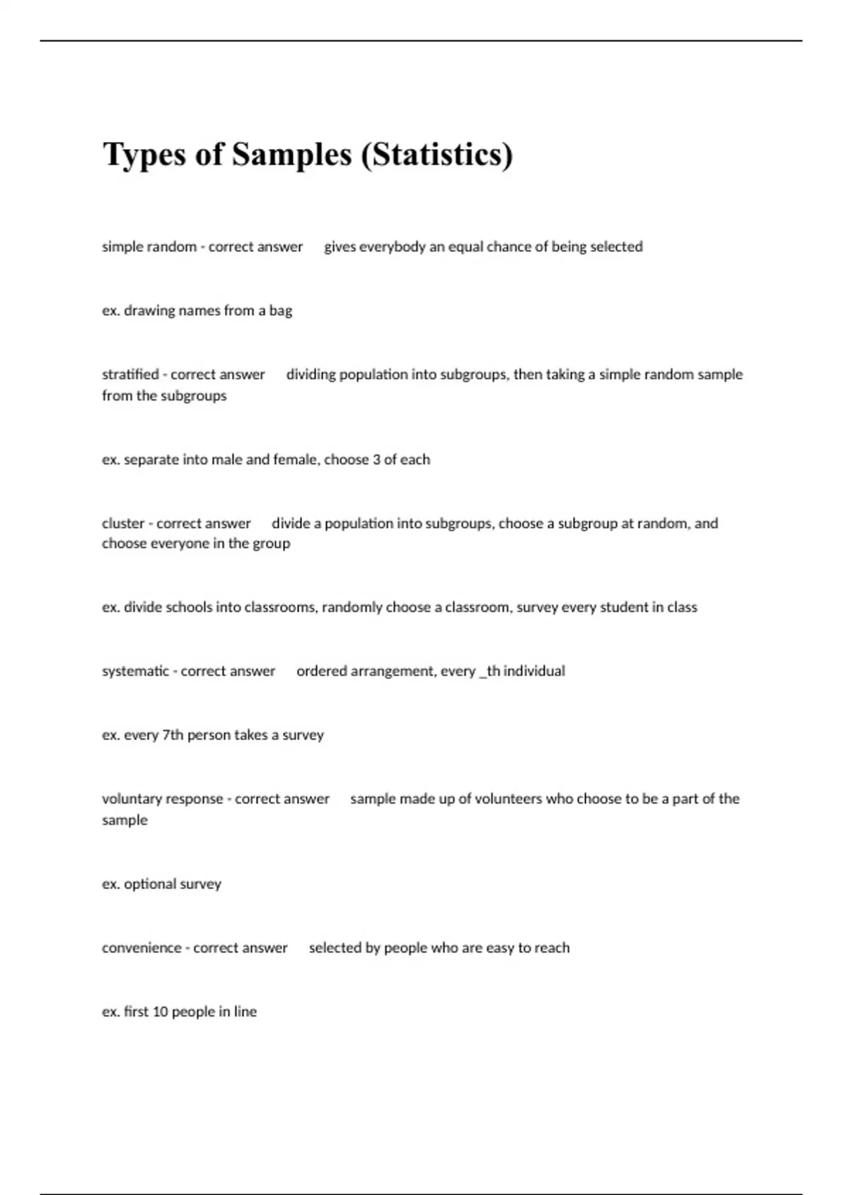 Types of Samples (Statistics) Complete And Verified Answers Solutions(graded a+)2024.