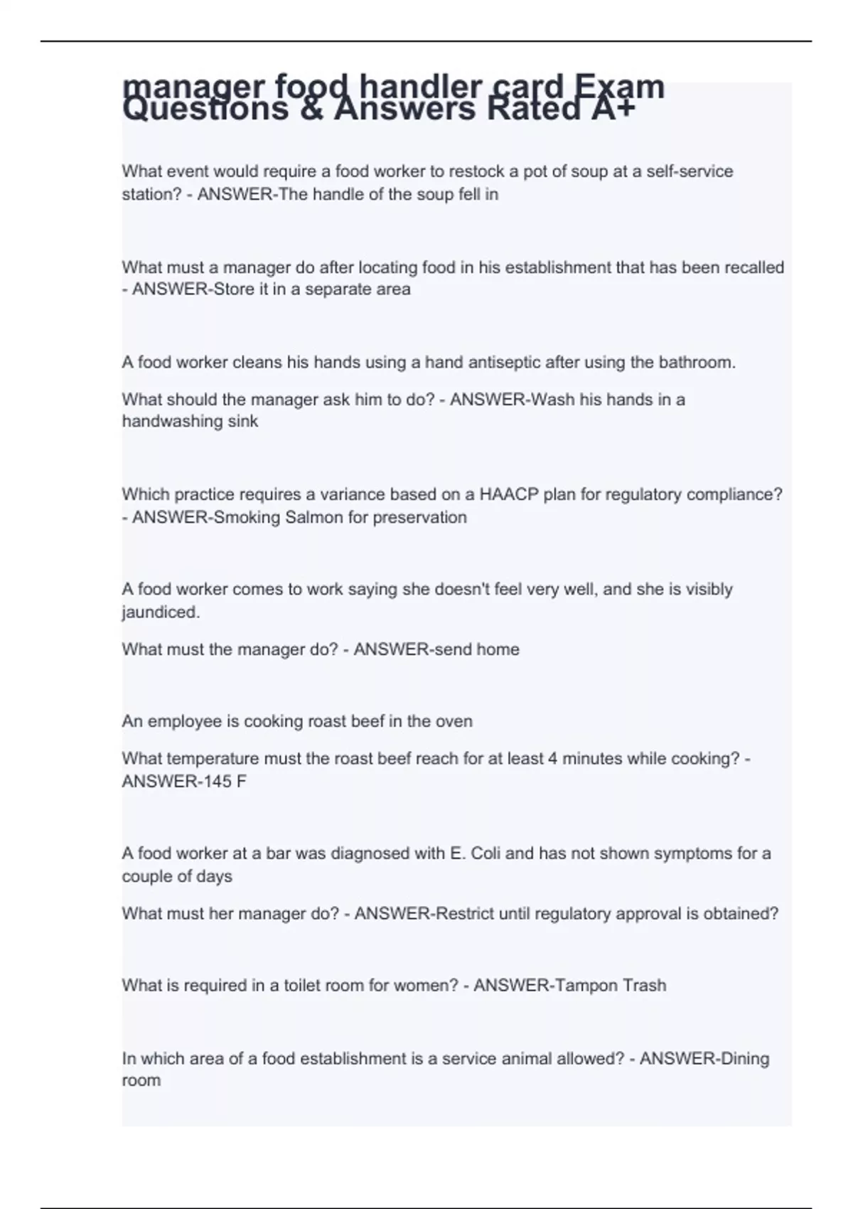What event would require a food worker to restock a pot of soup at a self-service station? - ANSWER-The handle of the soup fell in What must a manager do after locating food in his establishment that has been recalled - ANSWER-Store it in a separate area A food worker cleans his hands using a hand antiseptic after using the bathroom. What should the manager ask him to do? - ANSWER-Wash his hands in a handwashing sink Which practice requires a variance based on a HAACP plan for regulatory compliance? - ANSWER-Smoking Salmon for preservation A food worker comes to work saying she doesn't feel very well, and she is visibly jaundiced. What must the manager do? - ANSWER-send home An employee is cooking roast beef in the oven What temperature must the roast beef reach for at least 4 minutes while cooking? - ANSWER-145 F A food worker at a bar was diagnosed with E. Coli and has not shown symptoms for a couple of days What must her manager do? - ANSWER-Restrict until regulatory approval is obtained? What is required in a toilet room for women? - ANSWER-Tampon Trash