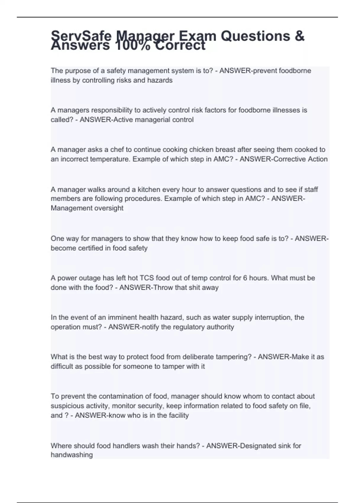 ServSafe Manager Exam Questions & Answers 100% Correct