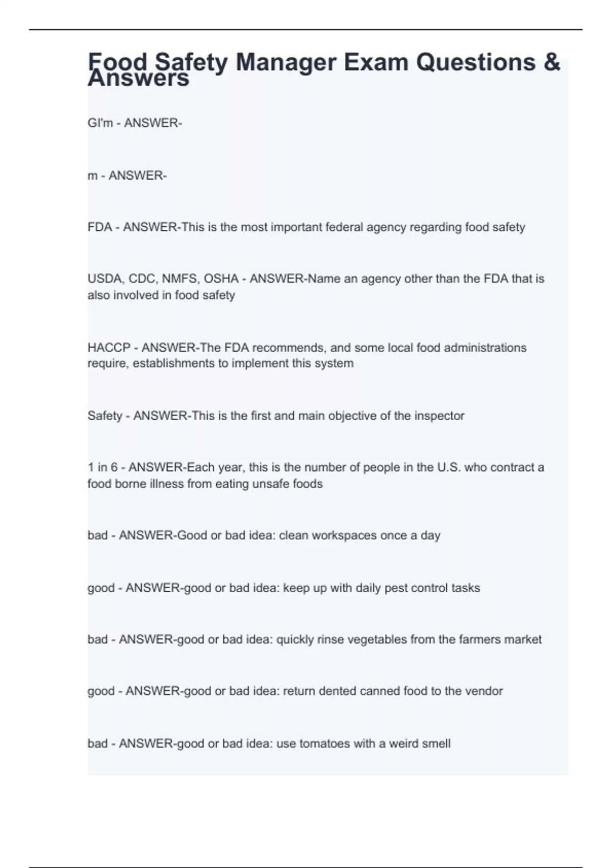FDA - ANSWER-This is the most important federal agency regarding food safety USDA, CDC, NMFS, OSHA - ANSWER-Name an agency other than the FDA that is also involved in food safety HACCP - ANSWER-The FDA recommends, and some local food administrations require, establishments to implement this system Safety - ANSWER-This is the first and main objective of the inspector 1 in 6 - ANSWER-Each year, this is the number of people in the U.S. who contract a food borne illness from eating unsafe foods bad - ANSWER-Good or bad idea: clean workspaces once a day good - ANSWER-good or bad idea: keep up with daily pest control tasks bad - ANSWER-good or bad idea: quickly rinse vegetables from the farmers market good - ANSWER-good or bad idea: return dented canned food to the vendor bad - ANSWER-good or bad idea: use tomatoes with a weird smell