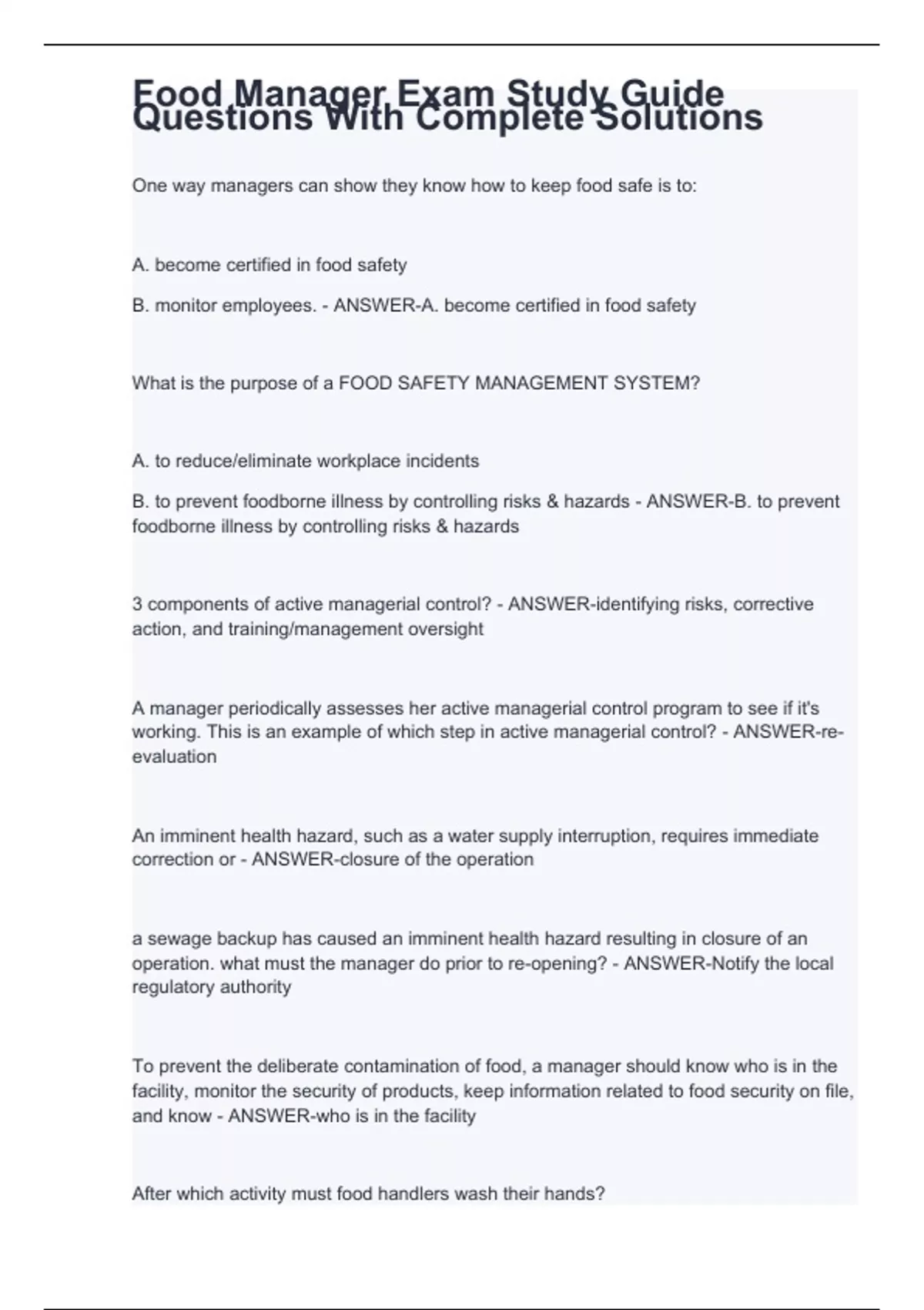 One way managers can show they know how to keep food safe is to: A. become certified in food safety B. monitor employees. - ANSWER-A. become certified in food safety What is the purpose of a FOOD SAFETY MANAGEMENT SYSTEM? A. to reduce/eliminate workplace incidents B. to prevent foodborne illness by controlling risks & hazards - ANSWER-B. to prevent foodborne illness by controlling risks & hazards 3 components of active managerial control? - ANSWER-identifying risks, corrective action, and training/management oversight A manager periodically assesses her active managerial control program to see if it's working. This is an example of which step in active managerial control? - ANSWER-re-evaluation An imminent health hazard, such as a water supply interruption, requires immediate correction or - ANSWER-closure of the operation a sewage backup has caused an imminent health hazard resulting in closure of an operation. what must the manager do prior to re-opening? - ANSWER-Notify the local regulatory authority To prevent the deliberate contamination of food, a manager should know who is in the facility, monitor the security of products, keep information related to food security on file, and know - ANSWER-who is in the facility