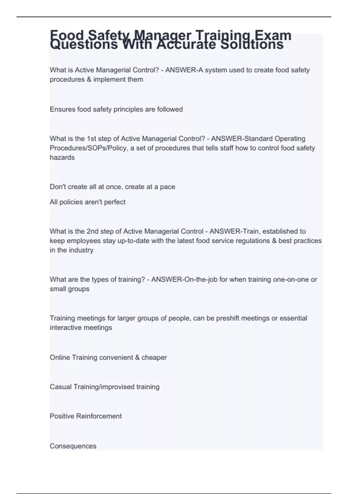 What is Active Managerial Control? - ANSWER-A system used to create food safety procedures & implement them Ensures food safety principles are followed What is the 1st step of Active Managerial Control? - ANSWER-Standard Operating Procedures/SOPs/Policy, a set of procedures that tells staff how to control food safety hazards Don't create all at once, create at a pace All policies aren't perfect What is the 2nd step of Active Managerial Control - ANSWER-Train, established to keep employees stay up-to-date with the latest food service regulations & best practices in the industry What are the types of training? - ANSWER-On-the-job for when training one-on-one or small groups Training meetings for larger groups of people, can be preshift meetings or essential interactive meetings Online Training convenient & cheaper Casual Training/improvised training Positive Reinforcement