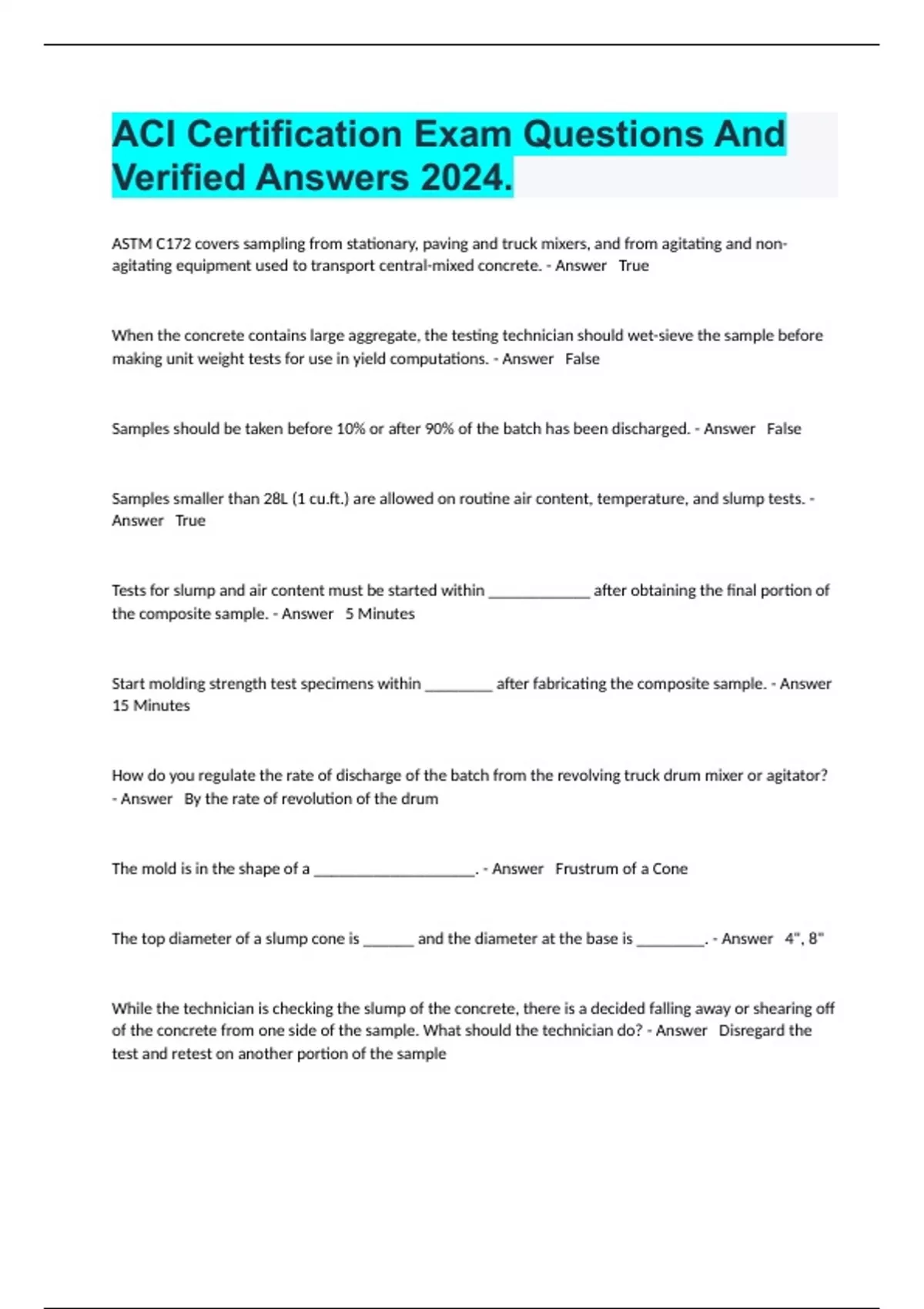 ASTM C172 covers sampling from stationary, paving and truck mixers, and from agitating and non-agitating equipment used to transport central-mixed concrete. - Answer True When the concrete contains large aggregate, the testing technician should wet-sieve the sample before making unit weight tests for use in yield computations. - Answer False Samples should be taken before 10% or after 90% of the batch has been discharged. - Answer False Samples smaller than 28L (1 .) are allowed on routine air content, temperature, and slump tests. - Answer True Tests for slump and air content must be started within ____________ after obtaining the final portion of the composite sample. - Answer 5 Minutes Start molding strength test specimens within ________ after fabricating the composite sample. - Answer 15 Minutes How do you regulate the rate of discharge of the batch from the revolving truck drum mixer or agitator? - Answer By the rate of revolution of the drum The mold is in the shape of a ___________________. - Answer Frustrum of a Cone The top diameter of a slump cone is ______ and the diameter at the base is ________. - Answer 4", 8" While the technician is checking the slump of the concrete, there is a decided falling away or shearing off of the concrete from one side of the sample. What should the technician do? - Answer Disregard the test and retest on another portion of the sample