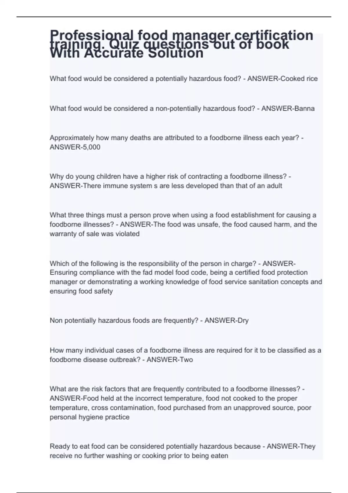 Professional food manager certification training. Quiz questions out of book With Accurate Solution
