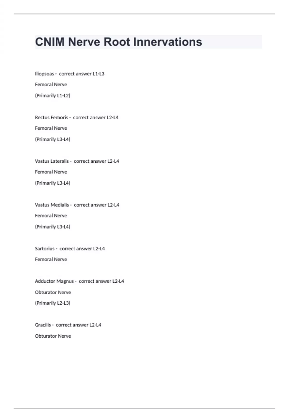 CNIM Nerve Root Innervations Question and answers rated A+ 2024 CNIM Nerve Root Innervations Iliopsoas - correct answer L1-L3 Femoral Nerve (Primarily L1-L2) Rectus Femoris - correct answer L2-L4 Femoral Nerve (Primarily L3-L4) Vastus Lateralis - correct answer L2-L4 Femoral Nerve (Primarily L3-L4) Vastus Medialis - correct answer L2-L4 Femoral Nerve (Primarily L3-L4) Sartorius - correct answer L2-L4 Femoral Nerve Adductor Magnus - correct answer L2-L4 Obturator Nerve (Primarily L2-L3)