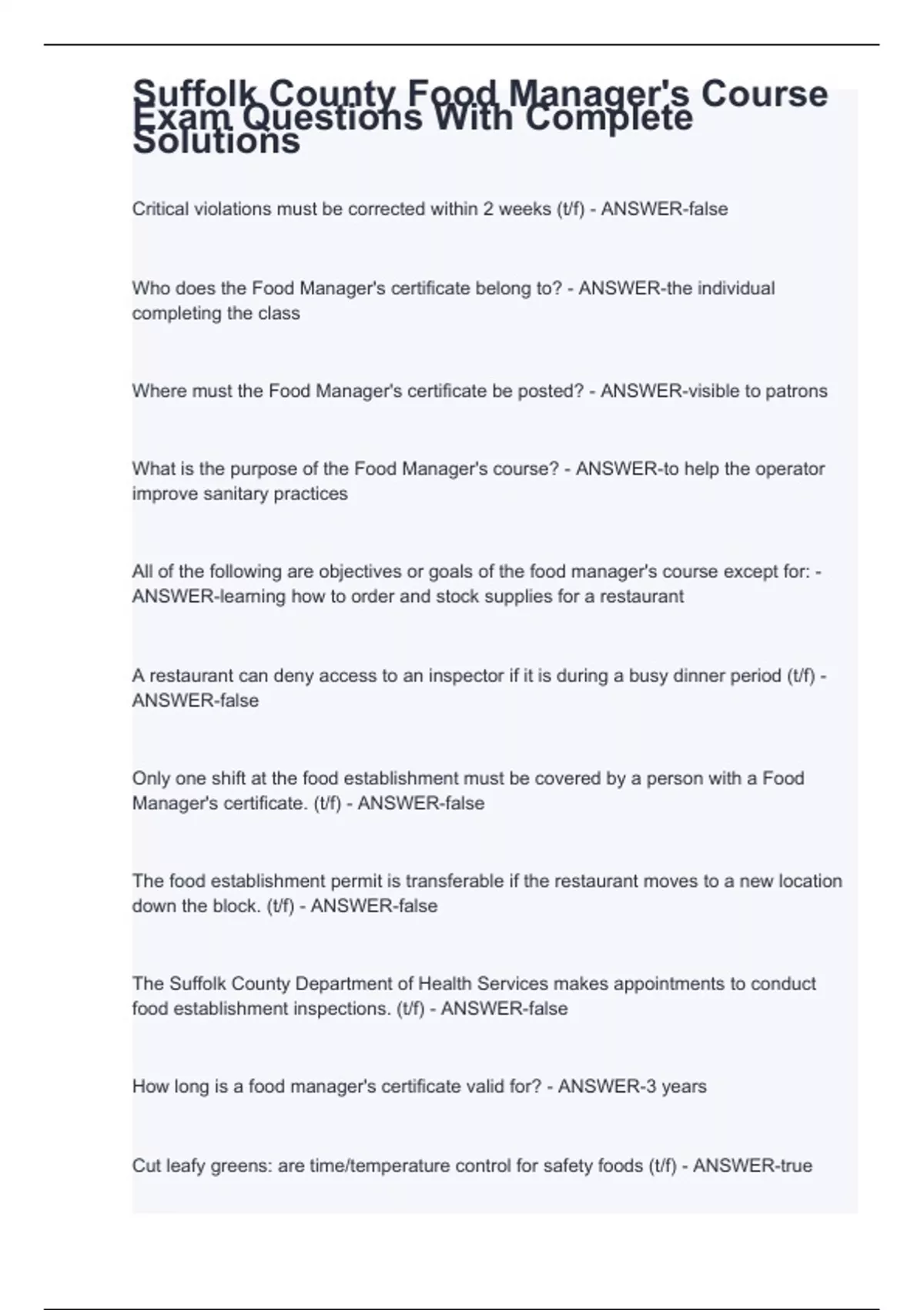 Critical violations must be corrected within 2 weeks (t/f) - ANSWER-false Who does the Food Manager's certificate belong to? - ANSWER-the individual completing the class Where must the Food Manager's certificate be posted? - ANSWER-visible to patrons What is the purpose of the Food Manager's course? - ANSWER-to help the operator improve sanitary practices All of the following are objectives or goals of the food manager's course except for: - ANSWER-learning how to order and stock supplies for a restaurant A restaurant can deny access to an inspector if it is during a busy dinner period (t/f) - ANSWER-false Only one shift at the food establishment must be covered by a person with a Food Manager's certificate. (t/f) - ANSWER-false The food establishment permit is transferable if the restaurant moves to a new location down the block. (t/f) - ANSWER-false The Suffolk County Department of Health Services makes appointments to conduct food establishment inspections. (t/f) - ANSWER-false How long is a food manager's certificate valid for? - ANSWER-3 years