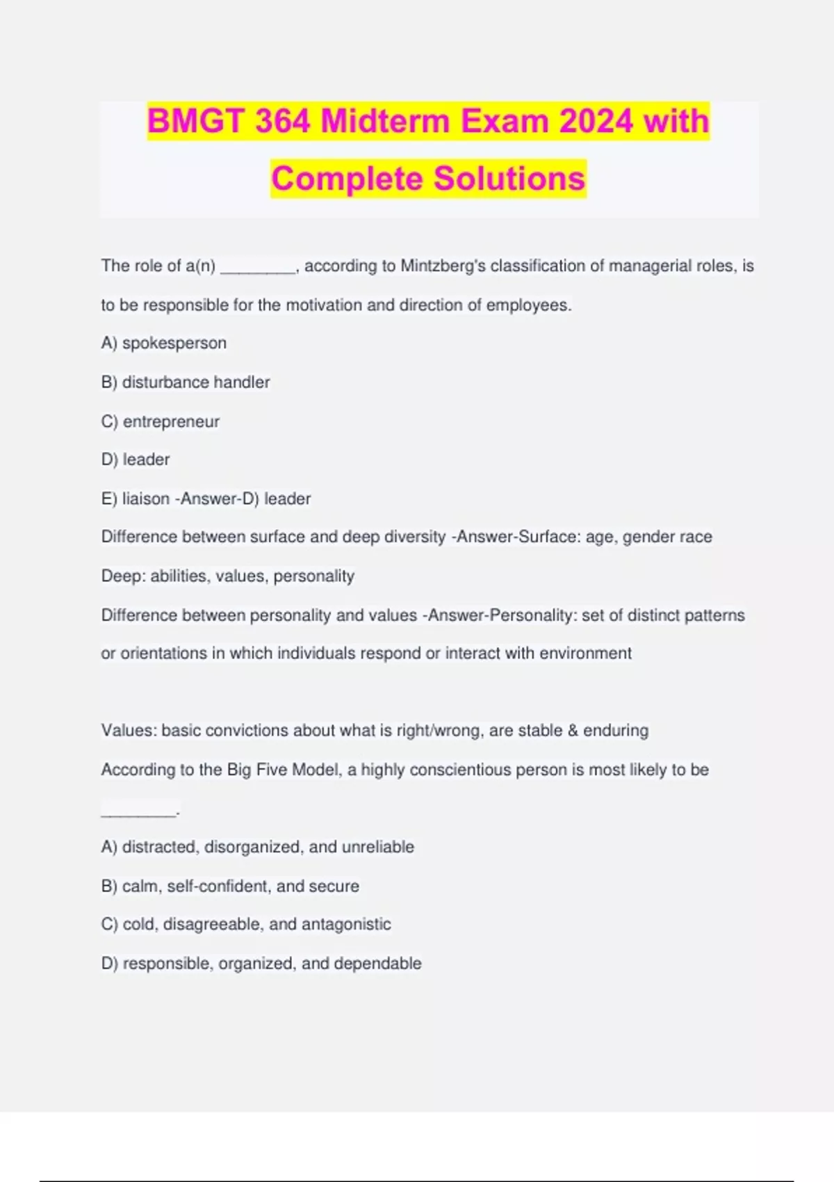 BMGT 364 Midterm Exam 2024 with Complete Solutions The role of a(n) ________, according to Mintzberg's classification of managerial roles, is to be responsible for the motivation and direction of employees. A) spokesperson B) disturbance handler C) entrepreneur D) leader E) liaison -Answer-D) leader Difference between surface and deep diversity -Answer-Surface: age, gender race Deep: abilities, values, personality Difference between personality and values -Answer-Personality: set of distinct patterns or orientations in which individuals respond or interact with environment Values: basic convictions about what is right/wrong, are stable & enduring According to the Big Five Model, a highly conscientious person is most likely to be ________. A) distracted, disorganized, and unreliable B) calm, self-confident, and secure C) cold, disagreeable, and antagonistic D) responsible, organized, and dependable E) reserved, timid, and quiet -Answer-D) responsible, organized, and dependable According to the Big Five Model, somehow who scores LOW on agreeableness would most likely be ________. A) distracted, disorganized, and unreliable B) calm, self-confident, and secure C) cold, disagreeable, and antagonistic D) responsible, organized, and dependable E) reserved, timid, and quiet -Answer-C) cold, disagreeable, and antagonistic According to trait activation theory, which of the following would be true ________. A) None of the below B) Personality is primarily determined by our moods C) Our personality traits are primarily activated by our genes D) Personality depends on the "strength" of a situation E) Some events can trigger personality -Answer-E) Some events can trigger personality Johanna Springer, who works as a sales executive at Pascal's Bank, is upset at the way her manager, Emma Womack, always calls her in for one-on-one meetings to discuss her underperformance. Though Springer makes a higher number of sales calls and works longer hours than last year, her sales figures are still low. She knows that the main reason behind her underperformance is the recent economic meltdown in the country. However, her manager feels that Springer's underperformance is the result of her laid back attitude and has nothing to do with external factors. In this situation, Womack's behavior is characterized by a(n) ________. A) anchoring bias B) contrast effect C) fundamental attribution error D) self-fulfilling prophecy E) pygmalion effect -Answer-C) fundamental attribution error Which of the following statements is NOT true regarding the rational decision-making model? A) It is necessary to accurately define the problem B) It involves weighting different choices and alternatives. C) It assumes that it will allow a person to choose the best alternative. D) It assumes that an individual is able to identify all relevant options in an unbiased manner. E) It is an unconscious decision-making process created from distilled experience. - Answer-E) It is an unconscious decision-making process created from distilled experience. Sonia Soans is corporate trainer. One of her favorite ways to start a training program is to present a case study and encourage members to think of the case in depth and discuss it amongst each other. Using the results of the activity she understands the baseline measures of the group's functioning. During one of her recent sessions, she observed that the group came to a consensus very quickly. However, when asked to present their views, the team members were not too confident and appeared to be under an illusion of unanimity. From the scenario, we can say that this group experienced ________. A) diversity B) groupshift C) role conflict D) groupthink E) social loafing -Answer-D) groupthink A team at Beta Corp has recently been formed. When asked by the CEO how the team is doing, the leader describes the team as characterized by close relationships and cohisiveness. Which stage of group development is this
