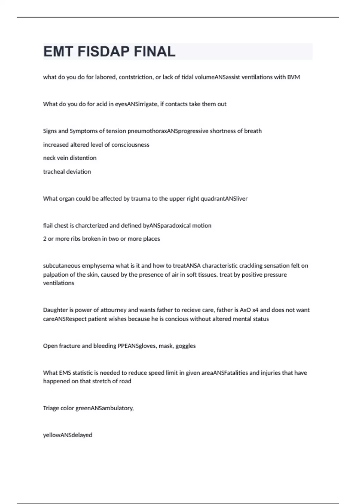 EMT FISDAP FINAL EXAM QUESTIONS WITH CORRECT ANSWERS (GRADED A+)