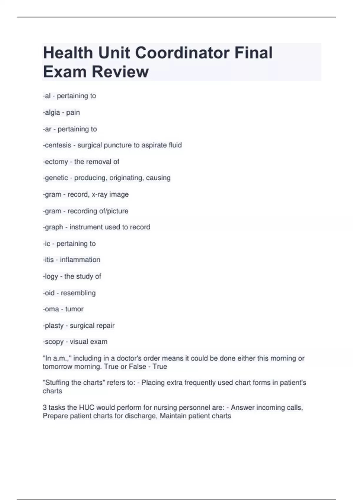 -al - pertaining to -algia - pain -ar - pertaining to -centesis - surgical puncture to aspirate fluid -ectomy - the removal of -genetic - producing, originating, causing -gram - record, x-ray image -gram - recording of/picture -graph - instrument used to record -ic - pertaining to -itis - inflammation -logy - the study of -oid - resembling -oma - tumor -plasty - surgical repair -scopy - visual exam "In a.m.," including in a doctor's order means it could be done either this morning or tomorrow morning. True or False - True "Stuffing the charts" refers to: - Placing extra frequently used chart forms in patient's charts 3 tasks the HUC would perform for nursing personnel are: - Answer incoming calls, Prepare patient charts for discharge, Maintain patient charts