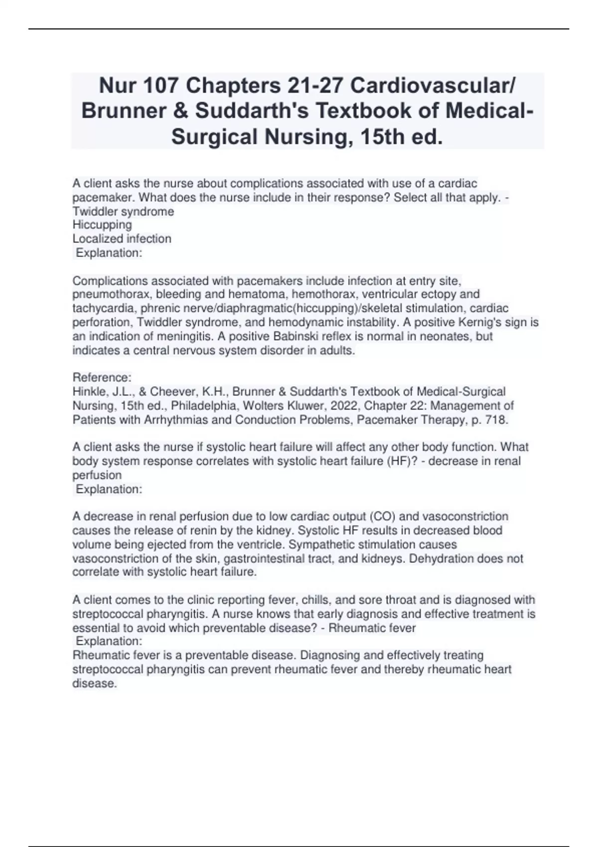 A client asks the nurse about complications associated with use of a cardiac pacemaker. What does the nurse include in their response? Select all that apply. - Twiddler syndrome Hiccupping Localized infection Explanation: Complications associated with pacemakers include infection at entry site, pneumothorax, bleeding and hematoma, hemothorax, ventricular ectopy and tachycardia, phrenic nerve/diaphragmatic(hiccupping)/skeletal stimulation, cardiac perforation, Twiddler syndrome, and hemodynamic instability. A positive Kernig's sign is an indication of meningitis. A positive Babinski reflex is normal in neonates, but indicates a central nervous system disorder in adults. Reference: Hinkle, J.L., & Cheever, K.H., Brunner & Suddarth's Textbook of Medical-Surgical Nursing, 15th ed., Philadelphia, Wolters Kluwer, 2022, Chapter 22: Management of Patients with Arrhythmias and Conduction Problems, Pacemaker Therapy, p. 718. A client asks the nurse if systolic heart failure will affect any other body function. What body system response correlates with systolic heart failure (HF)? - decrease in renal perfusion Explanation: A decrease in renal perfusion due to low cardiac output (CO) and vasoconstriction causes the release of renin by the kidney. Systolic HF results in decreased blood volume being ejected from the ventricle. Sympathetic stimulation causes vasoconstriction of the skin, gastrointestinal tract, and kidneys. Dehydration does not correlate with systolic heart failure. A client comes to the clinic reporting fever, chills, and sore throat and is diagnosed with streptococcal pharyngitis. A nurse knows that early diagnosis and effective treatment is essential to avoid which preventable disease? - Rheumatic fever Explanation: Rheumatic fever is a preventable disease. Diagnosing and effectively treating streptococcal pharyngitis can prevent rheumatic fever and thereby rheumatic heart disease.
