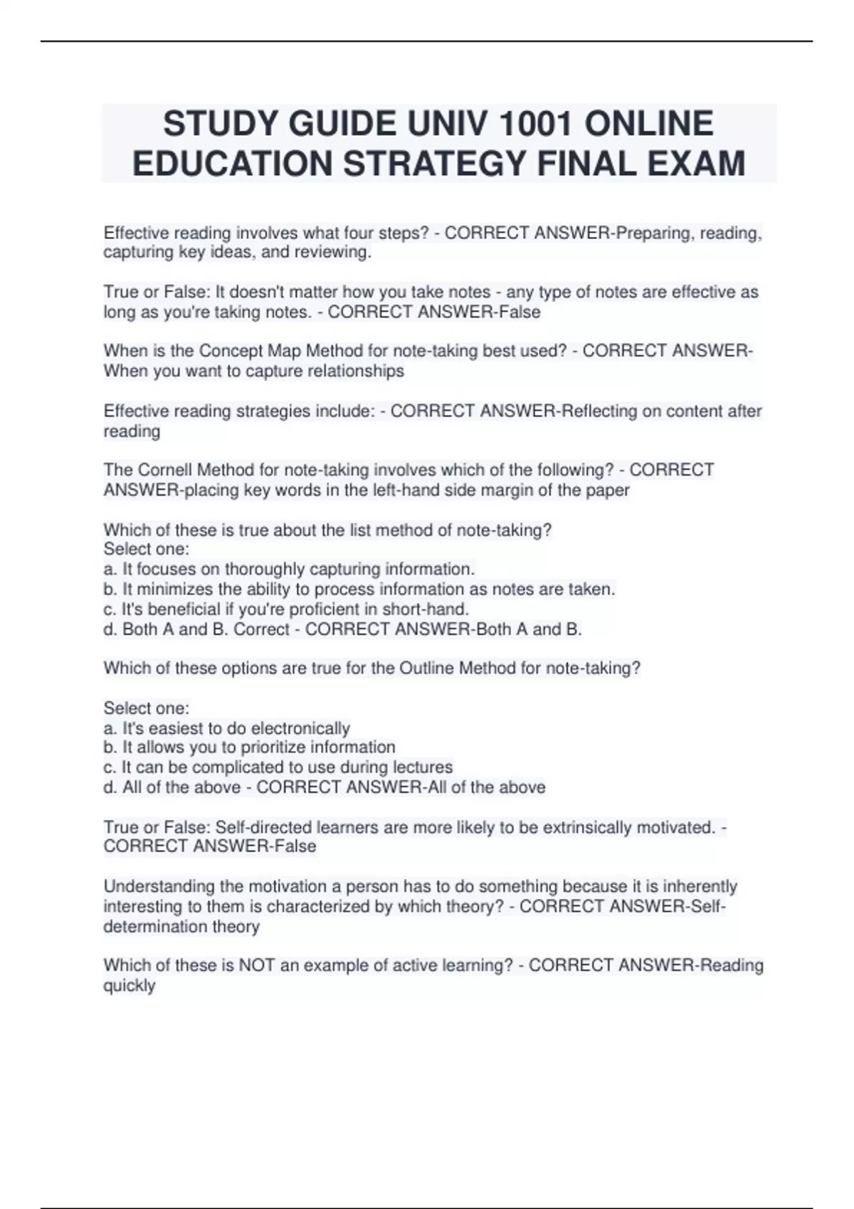 STUDY GUIDE UNIV 1001 ONLINE EDUCATION STRATEGY FINAL EXAM Effective reading involves what four steps? - CORRECT ANSWER-Preparing, reading, capturing key ideas, and reviewing. True or False: It doesn't matter how you take notes - any type of notes are effective as long as you're taking notes. - CORRECT ANSWER-False When is the Concept Map Method for note-taking best used? - CORRECT ANSWERWhen you want to capture relationships Effective reading strategies include: - CORRECT ANSWER-Reflecting on content after reading The Cornell Method for note-taking involves which of the following? - CORRECT ANSWER-placing key words in the left-hand side margin of the paper Which of these is true about the list method of note-taking? Select one: a. It focuses on thoroughly capturing information. b. It minimizes the ability to process information as notes are taken. c. It's beneficial if you're proficient in short-hand. d. Both A and B. Correct - CORRECT ANSWER-Both A and B. Which of these options are true for the Outline Method for note-taking? Select one: a. It's easiest to do electronically b. It allows you to prioritize information c. It can be complicated to use during lectures d. All of the above - CORRECT ANSWER-All of the above True or False: Self-directed learners are more likely to be extrinsically motivated. - CORRECT ANSWER-False Understanding the motivation a person has to do something because it is inherently interesting to them is characterized by which theory? - CORRECT ANSWER-Selfdetermination theory Which of these is NOT an example of active learning? - CORRECT ANSWER-Reading quickly
