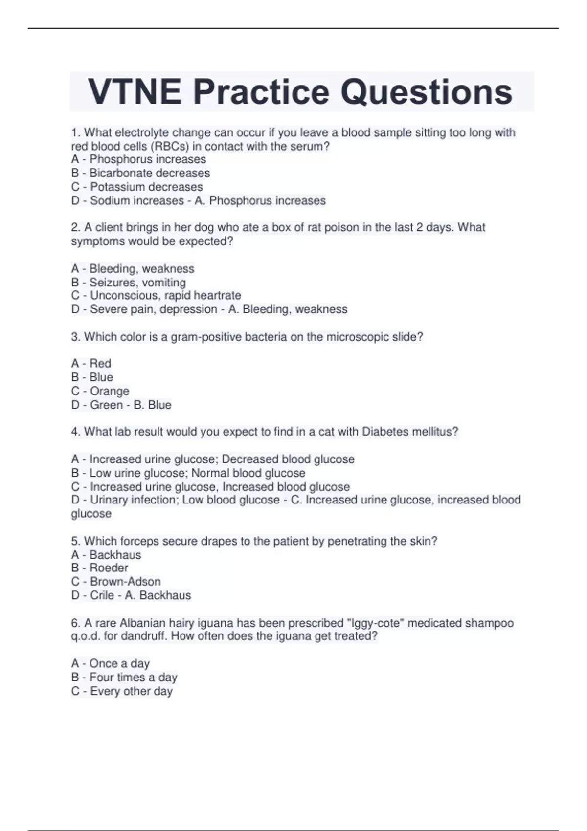 1. What electrolyte change can occur if you leave a blood sample sitting too long with red blood cells (RBCs) in contact with the serum? A - Phosphorus increases B - Bicarbonate decreases C - Potassium decreases D - Sodium increases - A. Phosphorus increases 2. A client brings in her dog who ate a box of rat poison in the last 2 days. What symptoms would be expected? A - Bleeding, weakness B - Seizures, vomiting C - Unconscious, rapid heartrate D - Severe pain, depression - A. Bleeding, weakness 3. Which color is a gram-positive bacteria on the microscopic slide? A - Red B - Blue C - Orange D - Green - B. Blue 4. What lab result would you expect to find in a cat with Diabetes mellitus? A - Increased urine glucose; Decreased blood glucose B - Low urine glucose; Normal blood glucose C - Increased urine glucose, Increased blood glucose D - Urinary infection; Low blood glucose - C. Increased urine glucose, increased blood glucose 5. Which forceps secure drapes to the patient by penetrating the skin? A - Backhaus B - Roeder C - Brown-Adson D - Crile - A. Backhaus 6. A rare Albanian hairy iguana has been prescribed "Iggy-cote" medicated shampoo q.o.d. for dandruff. How often does the iguana get treated? A - Once a day B - Four times a day C - Every other day D - As needed - C. Every other da