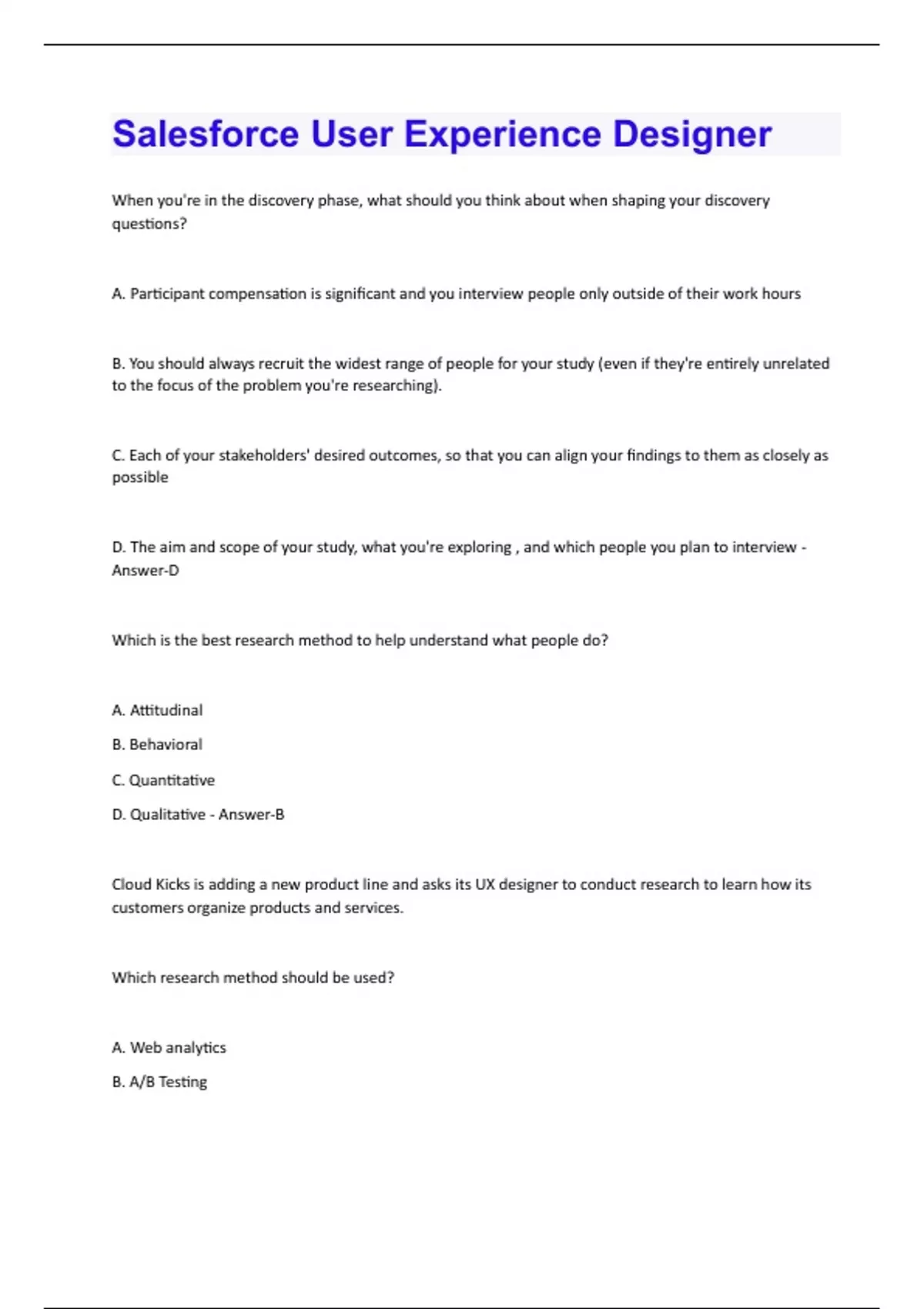 When you're in the discovery phase, what should you think about when shaping your discovery questions? A. Participant compensation is significant and you interview people only outside of their work hours B. You should always recruit the widest range of people for your study (even if they're entirely unrelated to the focus of the problem you're researching). C. Each of your stakeholders' desired outcomes, so that you can align your findings to them as closely as possible D. The aim and scope of your study, what you're exploring , and which people you plan to interview - Answer-D Which is the best research method to help understand what people do? A. Attitudinal B. Behavioral C. Quantitative D. Qualitative - Answer-B Cloud Kicks is adding a new product line and asks its UX designer to conduct research to learn how its customers organize products and services. Which research method should be used? A. Web analytics B. A/B TestingC. Card sorting D. Eye tracking testing - Answer-C. Card Sorting What is Card Sorting? - Answer-Card sorting is a UX research technique in which users organize topics into groups. Which is an important principle of the Salesforce personas? A. They are tied to the users' titles and roles B. They focus on users' demographic characteristics C. They are based on users' goals, behaviors, and motivations. D. They are based only on the things users do in the Salesforce platform, rather than on all of their job responsibilities. - Answer-C. Which of these can help you integrate personas into your design and development process? A. Send an email to the project team with all personas listed, assuming priority and value will be obvious. B. Make sure the project team focuses equally on all of the personas rather than aligning on a primary persona. C. Encourage the project team to only focus on the revenue-generating personas first. D. Schedule a meeting with your colleagues to introduce the personas, and collaborate on writing user stores. - Answer-D. What is the best practice to keep prototypes as low-to-mid-fidelity during the early stages of rapid prototyping? A. When high-fidelity design is done, the time for feedback and testing is over.B. Rapid prototyping involves quick feedback and iteration so high-fidelity would be a waste of time. C. Testers are easily distracted by high-fidelity design and therefore feedback is minimal. D. Rapid prototyping tools are made to create only low-to-mid-fidelity designs. - Answer-B. What is a key consideration for using color responsibly with accessibility in mind? A. Ensure there's enough contrast between adjacent colors B. Use bright, easy-to-find colors C. Ensure color is the only indicator of intended meaning D. Only primary colors should be used as they are the most accessible. - Answer-A