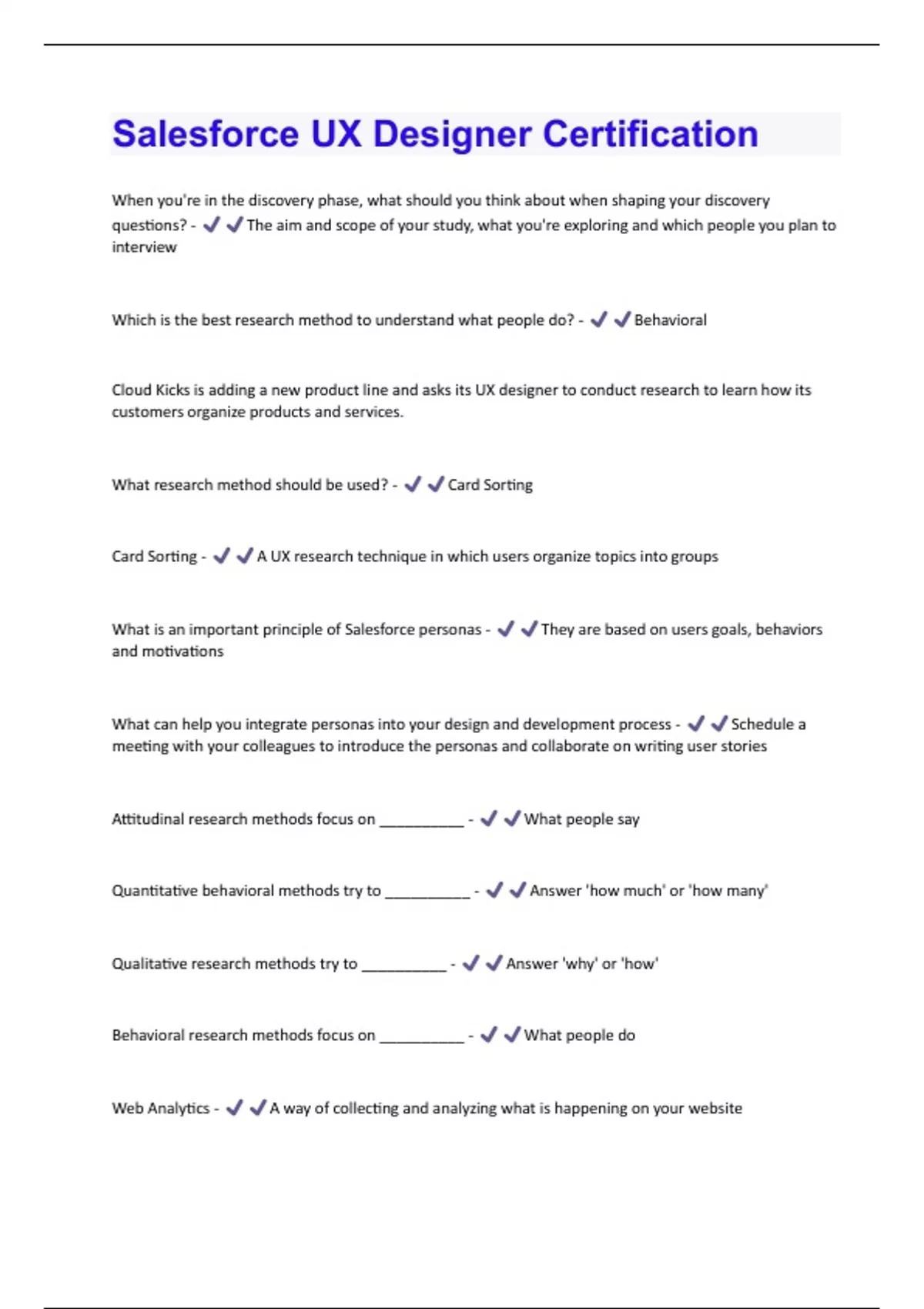 When you're in the discovery phase, what should you think about when shaping your discovery questions? - The aim and scope of your study, what you're exploring and which people you plan to interview Which is the best research method to understand what people do? - Behavioral Cloud Kicks is adding a new product line and asks its UX designer to conduct research to learn how its customers organize products and services. What research method should be used? - Card Sorting Card Sorting - A UX research technique in which users organize topics into groups What is an important principle of Salesforce personas - They are based on users goals, behaviors and motivations What can help you integrate personas into your design and development process - Schedule a meeting with your colleagues to introduce the personas and collaborate on writing user stories Attitudinal research methods focus on __________ - What people say Quantitative behavioral methods try to __________ - Answer 'how much' or 'how many' Qualitative research methods try to __________ - Answer 'why' or 'how' Behavioral research methods focus on __________ - What people do Web Analytics - A way of collecting and analyzing what is happening on your websiteA/B Testing - Process of showing two variants of the same web page to different segments of visitors Eye Tracking Testing - Observation and recording of the eye behavior such as pupil dilations and movement Hawthorne Effect - The alteration of behavior by the subjects of a study due to their awareness of being observed Two factors that should be taken into consideration when formulating discovery questions - 1. Aim: the intent of your work- what are you trying to find out 2. Scope: Who you're researching and how you're doing your analysis Process Mapping - Visual documentation of a business process Why is it best practice to keep prototypes as low to mid-fidelity during the early stages of rapid prototyping? - Rapid prototyping involves quick feedback and iteration so high-fidelity would be a waste of type Feedback, collaboration and testing should be done in __________ phase of prototyping - Every T or F It is inefficient to create high-fidelity designs when ideas and feedback are fast and furious - True What is a key consideration for using color responsibly with accessibility in mind? - Ensure there's enough contrast between adjacent colors What feature does a screen reader user commonly use to navigate through a page? - Heading structureWhat type WCAG restrictions are crucial to follow when designing animation for the web? - 1. Limited flashing or blinking 2. Animations longer than 5 seconds can be stopped or paused Wireframe - Layouts meant to communicate the structure of an app or web page Focuses on function rather than visual design A preliminary version of a product or idea that lets project stakeholders test user interfaces - Prototype A difference between two or more elements in a composition - Contrast Parallax Effect - A visual effect that adds the illusion of depth Most commonly used when a web page's background moves at a slower rate than the foreground What is the goal of relationship design? - Builds on both UX design and service design by focusing on connection, engagement and values What criteria does relationship design add to the human-centered design requirements of desirability, feasibility and viability? - Inclusivity, sustainability and ethics What is the focus of service design? - The total customer experience- online, app, in-person, etc. Creating a consistent brand experience for customers across distinct interactionsA creative approach to solving peoples problems by identifying their needs and creating solutions that meet those needs - Human-centered design The 4 mindsets of relationship design - 1. Compassion 2. Courage 3. Intention 4. Reciprocity