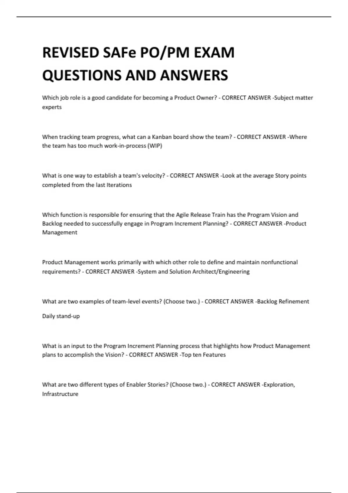 REVISED SAFe PO/PM EXAM QUESTIONS AND ANSWERS Which job role is a good candidate for becoming a Product Owner? - CORRECT ANSWER -Subject matter experts When tracking team progress, what can a Kanban board show the team? - CORRECT ANSWER -Where the team has too much work-in-process (WIP) What is one way to establish a team's velocity? - CORRECT ANSWER -Look at the average Story points completed from the last Iterations Which function is responsible for ensuring that the Agile Release Train has the Program Vision and Backlog needed to successfully engage in Program Increment Planning? - CORRECT ANSWER -Product Management Product Management works primarily with which other role to define and maintain nonfunctional requirements? - CORRECT ANSWER -System and Solution Architect/Engineering What are two examples of team-level events? (Choose two.) - CORRECT ANSWER -Backlog Refinement Daily stand-up What is an input to the Program Increment Planning process that highlights how Product Management plans to accomplish the Vision? - CORRECT ANSWER -Top ten Features What are two different types of Enabler Stories? (Choose two.) - CORRECT ANSWER -Exploration, Infrastructure