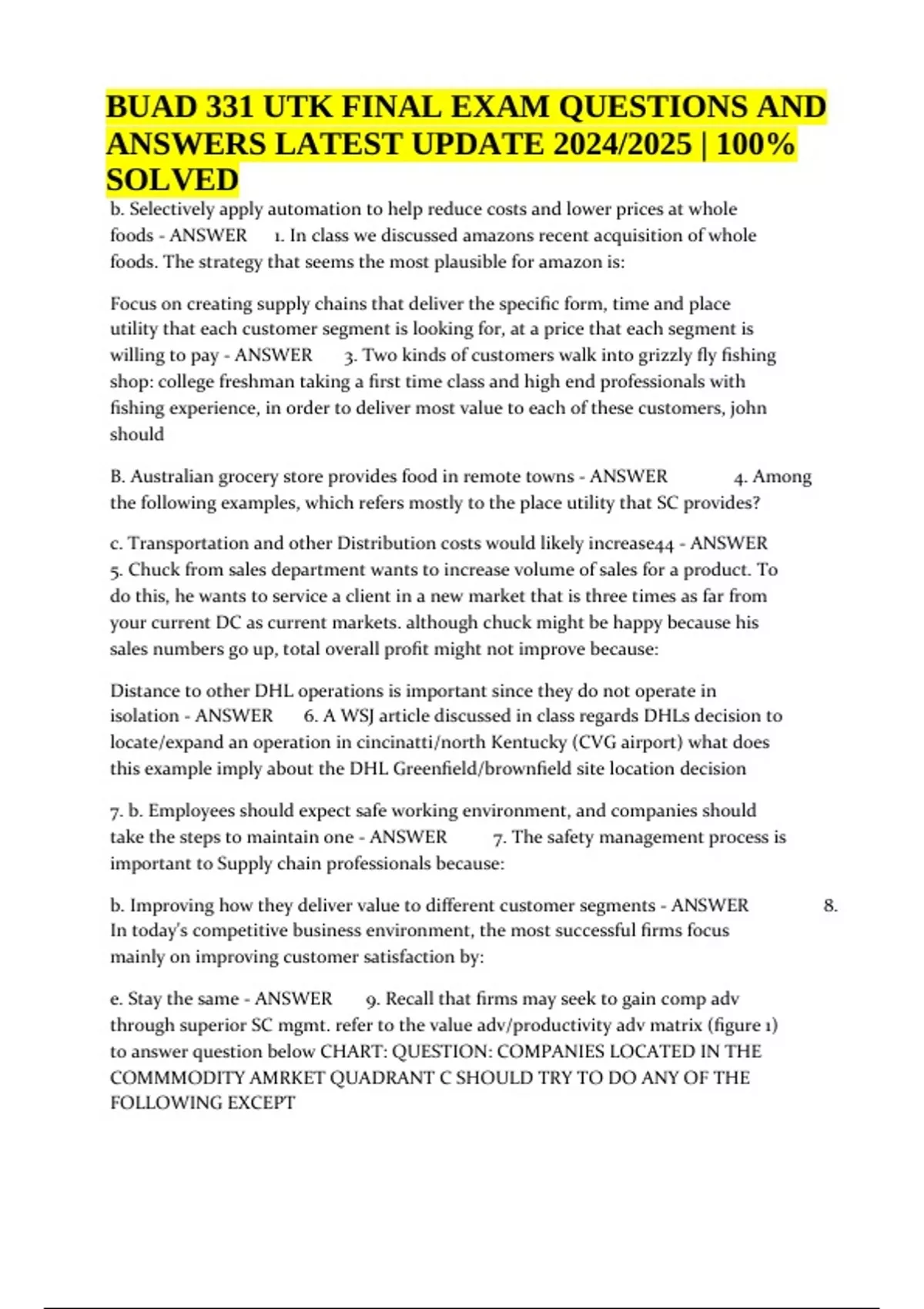 BUAD 331 UTK FINAL EXAM QUESTIONS AND ANSWERS LATEST UPDATE 2024/2025 | 100% SOLVED. Focus on creating supply chains that deliver the specific form, time and place utility that each customer segment is looking for, at a price that each segment is willing to pay - ANSWER 3. Two kinds of customers walk into grizzly fly fishing shop: college freshman taking a first time class and high end professionals with fishing experience, in order to deliver most value to each of these customers, john should B. Australian grocery store provides food in remote towns - ANSWER 4. Among the following examples, which refers mostly to the place utility that SC provides? c. Transportation and other Distribution costs would likely increase44 - ANSWER 5. Chuck from sales department wants to increase volume of sales for a product. To do this, he wants to service a client in a new market that is three times as far from your current DC as current markets. although chuck might be happy because his sales numbers go up, total overall profit might not improve because: Distance to other DHL operations is important since they do not operate in isolation - ANSWER 6. A WSJ article discussed in class regards DHLs decision to locate/expand an operation in cincinatti/north Kentucky (CVG airport) what does this example imply about the DHL Greenfield/brownfield site location decision 7. b. Employees should expect safe working environment, and companies should take the steps to maintain one - ANSWER 7. The safety management process is important to Supply chain professionals because: b. Improving how they deliver value to different customer segments - ANSWER 8. In today's competitive business environment, the most successful firms focus mainly on improving customer satisfaction by: e. Stay the same - ANSWER 9. Recall that firms may seek to gain comp adv through superior SC mgmt. refer to the value adv/productivity adv matrix (figure 1) to answer question below CHART: QUESTION: COMPANIES LOCATED IN THE COMMMODITY AMRKET QUADRANT C SHOULD TRY TO DO ANY OF THE FOLLOWING EXCEPT BUAD 331 UTK FINAL EXAM QUESTIONS AND ANSWERS LATEST UPDATE 2024/2025 | 100% SOLVED 10. Supply chain management: - ANSWER is the systematic coordination of purchasing, manufacturing management and distribution upstream with suppliers and downstream to customers b. Is pulled closer to actual time (Shortens), improves - ANSWER 11. As the time horizon for planning SC activities ____< the accuracy of the planning ___ c. Creating a production- oriented focus across SC - ANSWER 12. Firms have been talking about the GREAT DIVIDE as one of their biggest challenges, among the following approaches, which would NOT help a business deal with the great divide? the top 20% of products and customers by sales or profitability are considered the A category and should receive the highest levels of customer service - ANSWER 13. According to the Pareto or 80/20 rule shown above: c. Establishing a standard customer service policy for all customers - ANSWER 14. Establishing a segmented customer service policy involves all of the following EXCEPT: to enable john to serve his best customers at a higher level and promote his best products - ANSWER 15. In GRIZZLY FF shop divides their products and customers into 3 categories based on profitability: "A"- these are the top 20 % of products and customers "B"- these are the next 50% of products and customers "C" these are the bottom 40% of products and customers WHAT WAS THE PURPOSE OF THIS ACTIVITY? c. Visibility and velocity - ANSWER According to the textbook author, in order to create SC responsiveness to customer demands a firm should focus on what two primary capabilities? b. Weighted moving avg - ANSWER A safety incident rate (RIR) measures the number of annual serious incidents in a manner that is similar to___? a. CORRECT: 75% = 1500/2000 - ANSWER Of 2000 deliveries from proctor and gamble to Walmart last year, 1500 fulfilled all 12 requirements of the perfect order, 300 fulfilled 11 out of 12 and 100 filled 10 out of 12 and 100 filled 9 out of 12. What was p and gs perfect order score b. illustrating how SC activities impact the components of the income statement and balance sheet that lead to the ROA ratio - ANSWER The strategic profit Model (Dupont model) can be used to illustrate the impact of logistics and supply chain management on ROA by: b. cash-to-cash cycle time - ANSWER The time it takes to convert a payment from raw materials into collection of revenue for the finished goods into which those raw materials where built is known as: a. Overestimate their competitive abilities - ANSWER Companies that do not benchmark their processes and companies that use limited SC benchmarking have been shown to? b. small improvements in SC activities can yield large improvements In ROA - ANSWER The strategic profit or Dupont model as discussed in class demonstrates the following principle: d. total cost of ownership - ANSWER If you take into account things such as maintenance, disposal, returns management and training when calculating the true cost of a product/service you are employing the concept of: a. correct: 13% - ANSWER 26. Given the pareto chart above, approx. how many of the customers are losing profit for the firm? CHART 13% fixed asset cost - ANSWER 27. A firm decides to outsource its warehousing to a 3rd party logistics providers, what financial component does this decision have the biggest impact on? a. best in class benchmarking - ANSWER 28. when a company in the electronics industry benchmarks the customer service processes used at Disney they are using?: Satisfy demand by putting the right product in customers' hands at the right time, right place, right quality, and right price. - ANSWER 28. when a company in the electronics industry benchmarks the customer service processes used at Disney they are using?: either provide lower levels or service to reduce cost-to-serve or raise product price - ANSWER 30. If Grizzly Fly-F