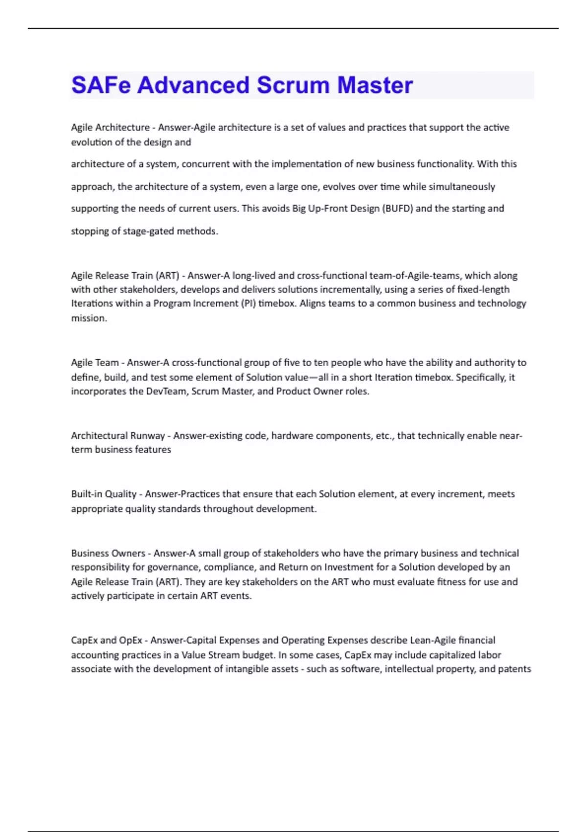 Agile Architecture - Answer-Agile architecture is a set of values and practices that support the active evolution of the design and architecture of a system, concurrent with the implementation of new business functionality. With this approach, the architecture of a system, even a large one, evolves over time while simultaneously supporting the needs of current users. This avoids Big Up-Front Design (BUFD) and the starting and stopping of stage-gated methods. Agile Release Train (ART) - Answer-A long-lived and cross-functional team-of-Agile-teams, which along with other stakeholders, develops and delivers solutions incrementally, using a series of fixed-length Iterations within a Program Increment (PI) timebox. Aligns teams to a common business and technology mission. Agile Team - Answer-A cross-functional group of five to ten people who have the ability and authority to define, build, and test some element of Solution value—all in a short Iteration timebox. Specifically, it incorporates the DevTeam, Scrum Master, and Product Owner roles. Architectural Runway - Answer-existing code, hardware components, etc., that technically enable nearterm business features Built-in Quality - Answer-Practices that ensure that each Solution element, at every increment, meets appropriate quality standards throughout development. Business Owners - Answer-A small group of stakeholders who have the primary business and technical responsibility for governance, compliance, and Return on Investment for a Solution developed by an Agile Release Train (ART). They are key stakeholders on the ART who must evaluate fitness for use and actively participate in certain ART events. CapEx and OpEx - Answer-Capital Expenses and Operating Expenses describe Lean-Agile financial accounting practices in a Value Stream budget. In some cases, CapEx may include capitalized labor associate with the development of intangible assets - such as software, intellectual property, and patentsCapabilities - Answer-A higher-level solution behavior that typically spans multiple ARTs. Capabilities are sized and split into multiple features so that they can be implemented in a single PI. Community of Practice (CoP) - Answer-An organized group of people with common interests in a specific technical or business domain. They collaborate regularly to share information, improve their skills, and actively work on advancing the general knowledge of the domain. Compliance - Answer-A strategy and set of activities and artifacts that allow teams to apply Lean-Agile development methods to build systems that have the highest possible possible quality, while simultaneously assuring they meet any regulatory, industry, or relevant standards. Continuous Delivery Pipeline - Answer-CD Pipeline (also referred to as 'pipeline') represents the workflows, activities, and automation needed to provide a continuous release of value to the end user. Continuous Deployment (CD) - Answer-The process that takes validated Features from Continuous Integration and deploys them into the production environment, where they are tested and readied for release. It is the third element in the four-part Continuous Delivery Pipeline of Continuous Exploration (CE), Continuous Integration (CI), Continuous Deployment, and Release on Demand. Continuous Exploration (CE) - Answer-The process of constantly exploring market and user needs, and defining a Vision, Roadmap, and set of Features that address those needs. It is the first element in the four-part Continuous Delivery Pipeline, preceding Continuous Integration (CI) Continuous Deployment (CD), and Release on Demand. Continuous Integration (CI) - Answer-The process of taking features from the Program Backlog and developing, testing, integrating, and validating them in a staging environment where they are ready for deployment and release. It is the second element in the four-part Continuous Delivery Pipeline. Core Values - Answer-The Four Core Values of alignment, Built-In Quality, transparency, and program execution represent the fundamental beliefs that are key to SAFE's effectiveness. These guiding principles represent the fundamental beliefs that are key to SAFe's effectiveness. These guiding principles help dictate behavior and action for everyone who participates in a SAFe portfolio. Customers - Answer-The ultimate buyer of every Solution. They are an integral part of the Lean-Agile development process and Value Stream and have specific responsibilities in SAFe.Dev Team - Answer-A subset of the Agile Team. It consists of the dedicated professionals who can develop and test a story, feature, or component. It typically includes software developers and testers, engineers and other dedicated specialists who are required to complete a vertical slice of functionality. DevOps - Answer-DevOps is a mindset, culture, and set of technical practices that stresses communication, collaboration, and close cooperation between Agile development teams and other technology professionals who are necessary for developing, testing, deploying, and maintaining software and systems. Develop on Cadence - Answer-A strategy for managing the inherent variability in solution development by making sure important events and activities occur on a regular, predictable schedule. It is an essential method for managing the inherent vaibility of systems development in a flow-based system.