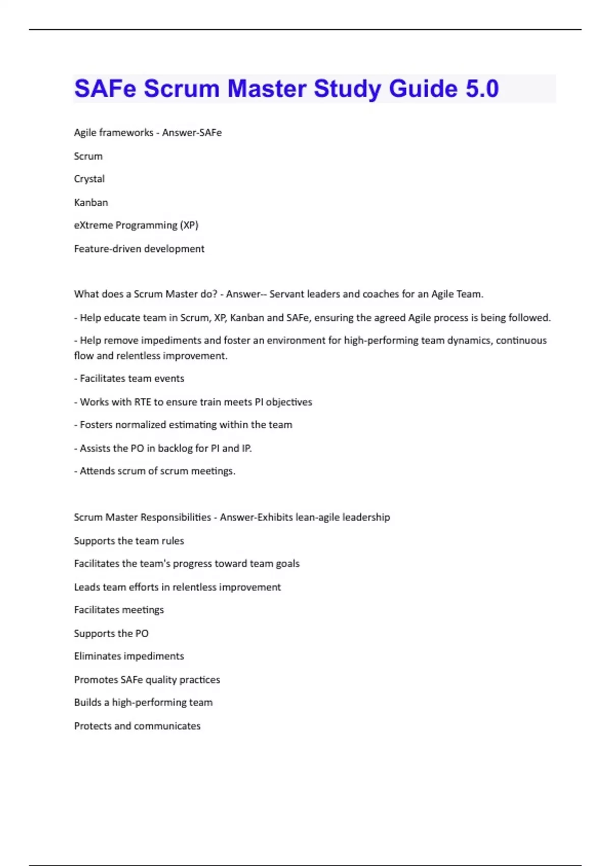 Agile frameworks - Answer-SAFe Scrum Crystal Kanban eXtreme Programming (XP) Feature-driven development What does a Scrum Master do? - Answer-- Servant leaders and coaches for an Agile Team. - Help educate team in Scrum, XP, Kanban and SAFe, ensuring the agreed Agile process is being followed. - Help remove impediments and foster an environment for high-performing team dynamics, continuous flow and relentless improvement. - Facilitates team events - Works with RTE to ensure train meets PI objectives - Fosters normalized estimating within the team - Assists the PO in backlog for PI and IP. - Attends scrum of scrum meetings. Scrum Master Responsibilities - Answer-Exhibits lean-agile leadership Supports the team rules Facilitates the team's progress toward team goals Leads team efforts in relentless improvement Facilitates meetings Supports the PO Eliminates impediments Promotes SAFe quality practices Builds a high-performing team Protects and communicatesResponsibilities on the train Coordinates with other teams Facilitates preparation and readiness for ART events Supports estimating ART - Answer-Agile Release Train PO - Answer-Product Owner Program Increment (PI) Planning - Answer-A cadence-based, face-to-face event that serves as the heartbeat of the Agile Release Train (ART), aligning all the teams on the ART to a common mission and vision. Innovation and Planning Iteration - Answer-Occurs every PI and serves multiple purposes. It acts as an estimating buffer for meeting PI objectives, as well as providing dedicated time for innovation, continuing education, and PI planning and Inspect and Adapt (I&A) events. Inspect & Adapt (I&A) - Answer-A significant event, held at the end of each PI, where the current state of the solution is demonstrated and evaluated by the train. Teams reflect and identify improvement backlog items via a structured, problem-solving workshop Iteration - Answer-A basic building block of Agile development. Each is a standard, fixed-length timebox, where Agile Teams deliver incremental value in the form of working, tested software and systems. Cycle - Defines, builds, integrates, & test. What is the recommended timebox duration for an Iteration? - Answer-2 weeks; however, 1-4 weeks is acceptable, depending on the business context. Who participates in the Inspect & Adapt (I&A) phase? - Answer-All stakeholders, including: 1. The Agile Teams 2. Release Train Engineer (RTE)3. System and Solution Architect Engineering 4. Product Management, Business Owners, and others on the Train