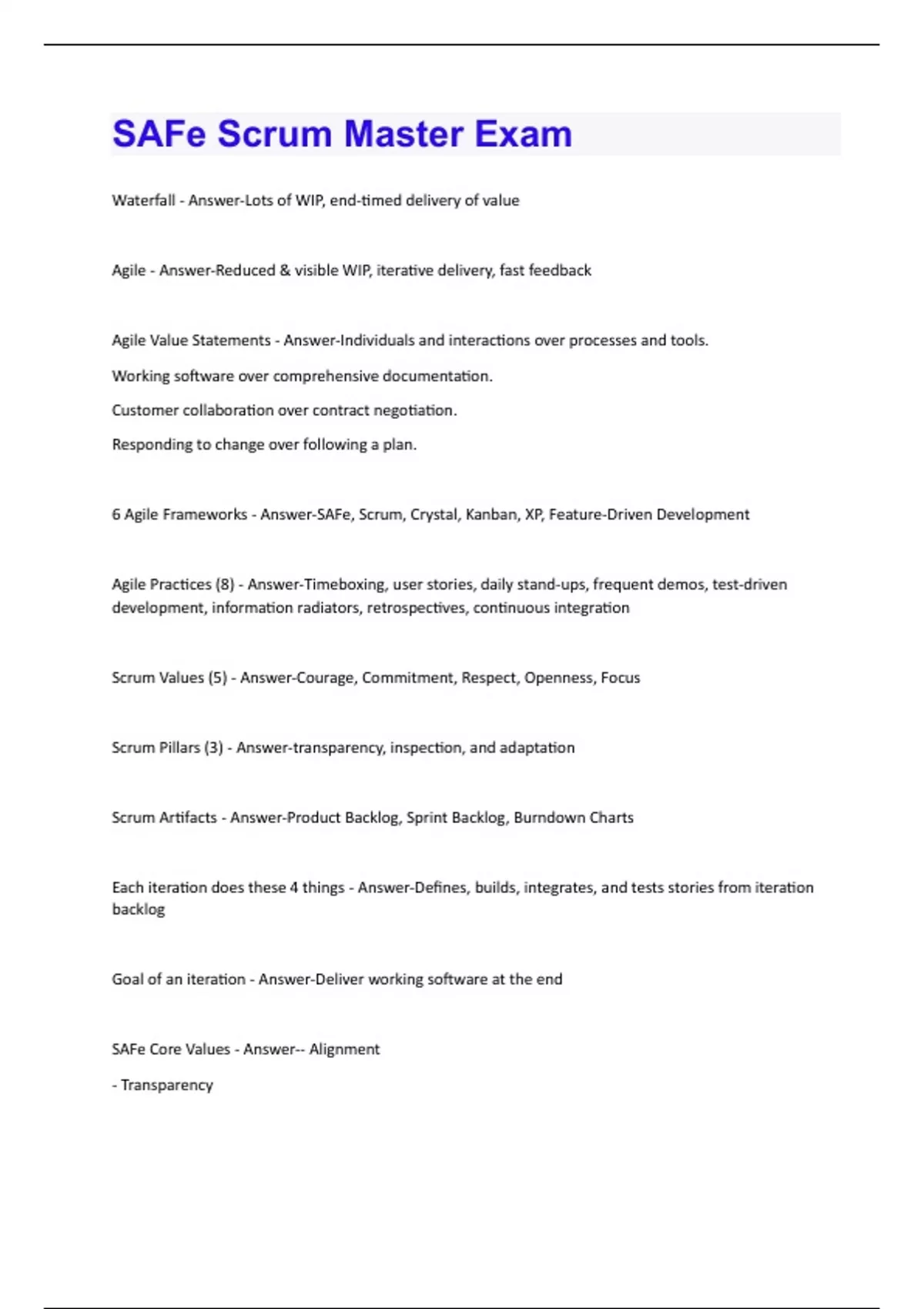 Waterfall - Answer-Lots of WIP, end-timed delivery of value Agile - Answer-Reduced & visible WIP, iterative delivery, fast feedback Agile Value Statements - Answer-Individuals and interactions over processes and tools. Working software over comprehensive documentation. Customer collaboration over contract negotiation. Responding to change over following a plan. 6 Agile Frameworks - Answer-SAFe, Scrum, Crystal, Kanban, XP, Feature-Driven Development Agile Practices (8) - Answer-Timeboxing, user stories, daily stand-ups, frequent demos, test-driven development, information radiators, retrospectives, continuous integration Scrum Values (5) - Answer-Courage, Commitment, Respect, Openness, Focus Scrum Pillars (3) - Answer-transparency, inspection, and adaptation Scrum Artifacts - Answer-Product Backlog, Sprint Backlog, Burndown Charts Each iteration does these 4 things - Answer-Defines, builds, integrates, and tests stories from iteration backlog Goal of an iteration - Answer-Deliver working software at the end SAFe Core Values - Answer-- Alignment - Transparency- Built-in Quality - Program Execution Non-functional requirements - Answer-Conditions that a proposed IT system must meet, such as working on certain hardware or giving results within a certain time. Should be part of the DoD. Program Increment (PI) - Answer-8-12 weeks or 4-6 sprints. A timebox in which an Agile Release Train (ART) delivers incremental value in the form of working, tested software and systems. The most common pattern for one is four development iterations, followed by one Innovation and Planning (IP) iteration. Innovation and Planning Iteration (PI) - Answer-Occurs every PI and serves multiple purposes. It acts as an estimating buffer for meeting PI objectives, as well as providing dedicated time for innovation, continuing education, and PI planning and Inspect and Adapt (I&A) events. SAFe Lean-Agile Principles (9 total) - Answer-1. Take an economic view. 2. Apply systems thinking. 3. Assume variability; preserve options 4. Build incrementally with fast, integrated learning cycles. 5. Base milestones on objective evaluation of working systems. 6. Visualize and limit WIP, reduce batch sizes, and manage queue lengths. 7. Apply cadence, synchronize with cross-domain planning. 8. Unlock the intrinsic motivation of knowledge workers. 9. Decentralize decision-making. Agile Release Train (ART) - Answer-5-12 teams (tycA long-lived and cross-functional team-of-Agile-teams, which along with other stakeholders, develops and delivers solutions incrementally, using a series of fixed-length Iterations within a Program Increment (PI) timebox. Aligns teams to a common business and technology mission. Product Management - Answer-has content authority for the Program Backlog (owns, defines, and prioritizes it). They are responsible for identifying Customer needs, prioritizing Features, guiding the work through the Program Kanban and developing the program Vision and Roadmap.Solution Management - Answer-has content authority for the Solution Backlog. They work with customers to understand their needs, prioritize Capabilities, create the Solution vision and roadmap, define requirements, and guide work through the Solution Kanban. Release Train Engineer (RTE) - Answer-A servant leader and coach for the Agile Release Train. Facilitates the major events and processes, and assists the teams in delivering value. Communicates with stakeholders, escalate impediments, help manage risk, and drive continuous improvement. Business Owners - Answer-The key stakeholders on the agile release train System Architect - Answer-provides architectural guidance and technical enablement to the teams on the train SAFe Program Events, time boxes, values - Answer-1) PI Planning / 2 days / Teams commit to set of objectives to be delivered in the PI 2) ART Sync / 1 hour / Train teams sync regarding the progress of the PI 3) System Demo / 2 hours / Deliverables reviewed with stakeholders who provide feedback 4) Inspect and Adapt Event / .5 day / Train reviews and improves its process before the next PI Each Value Stream produces one or more ... - Answer-Solutions, which are products, services, or systems delivered to the Customer, whether internal or external to the Enterprise.