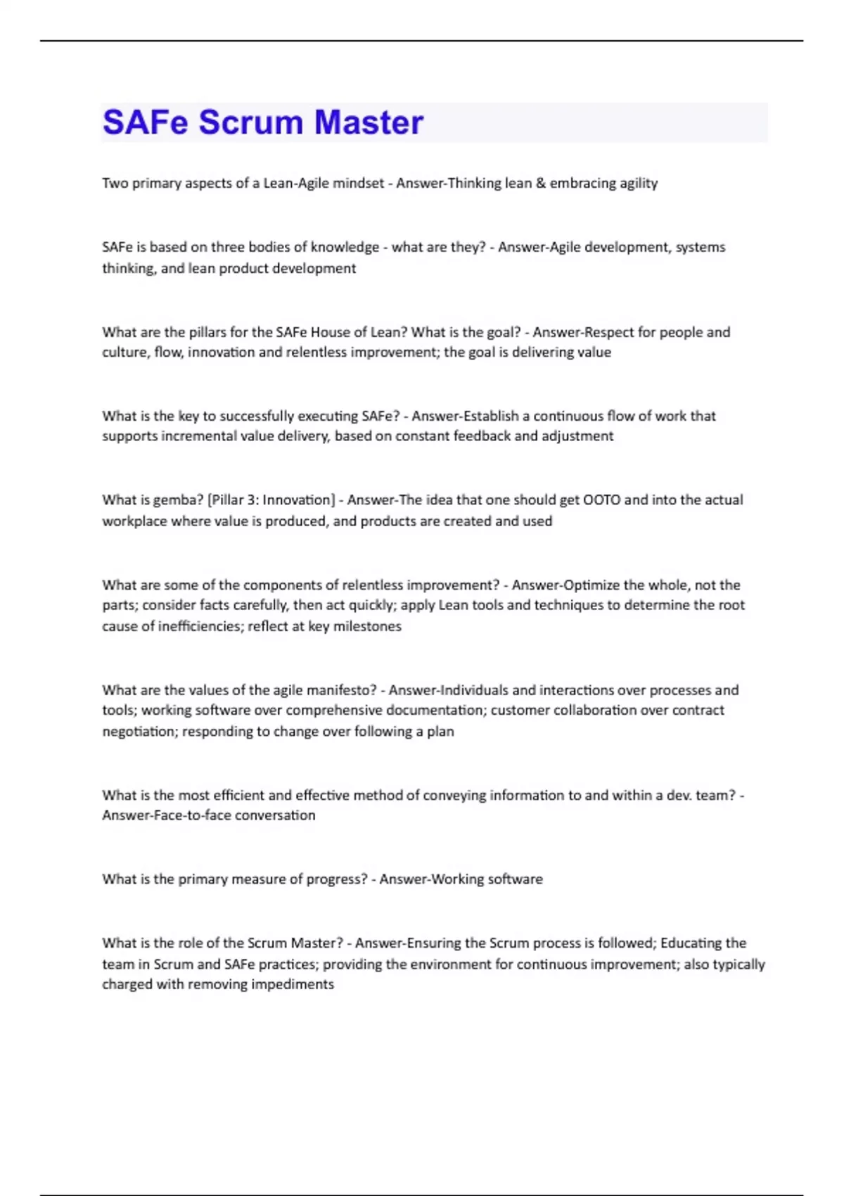 Two primary aspects of a Lean-Agile mindset - Answer-Thinking lean & embracing agility SAFe is based on three bodies of knowledge - what are they? - Answer-Agile development, systems thinking, and lean product development What are the pillars for the SAFe House of Lean? What is the goal? - Answer-Respect for people and culture, flow, innovation and relentless improvement; the goal is delivering value What is the key to successfully executing SAFe? - Answer-Establish a continuous flow of work that supports incremental value delivery, based on constant feedback and adjustment What is gemba? [Pillar 3: Innovation] - Answer-The idea that one should get OOTO and into the actual workplace where value is produced, and products are created and used What are some of the components of relentless improvement? - Answer-Optimize the whole, not the parts; consider facts carefully, then act quickly; apply Lean tools and techniques to determine the root cause of inefficiencies; reflect at key milestones What are the values of the agile manifesto? - Answer-Individuals and interactions over processes and tools; working software over comprehensive documentation; customer collaboration over contract negotiation; responding to change over following a plan What is the most efficient and effective method of conveying information to and within a dev. team? - Answer-Face-to-face conversation What is the primary measure of progress? - Answer-Working software What is the role of the Scrum Master? - Answer-Ensuring the Scrum process is followed; Educating the team in Scrum and SAFe practices; providing the environment for continuous improvement; also typically charged with removing impedimentsWhy do some teams apply WIP limits? - Answer-To create a "pull" process within the iteration and to continuously balance the work to increase throughput To build quality into the code and component level (and thus being able to scale), what are five practices that supplement the project managements practices of Scrum? - Answer-Continuous Integration, TestFirst, Refactoring, pair work, and collective ownership In the Scrum Master role, what do they spend most of their time doing? - Answer-Helping other team members communicate, coordinate and cooperate What is the Product Owner (PO) responsible for in their role? - Answer-Defining stories; prioritizing the team backlog; maintain the conceptual and technical integrity of features/components for team Who has the responsibility of accepting the final iteration plan? - Answer-Product Owner While operating within the context of the ART, teams are... - Answer-empowered, self-organizing and self-managing What are the steps for a team in building incremental value? - Answer-Define, Build, Test, Deploy What is the one real measure of value, velocity and progress? - Answer-The demo of fully integrated work from all teams during the prior iteration (System Demo) Who is ultimately responsible for the adoption, success and ongoing improvement of Lean-Agile development? - Answer-An organization's managers, leaders and executives What are the four core values that define SAFe's essential ideals and beliefs? - Answer-Alignment, builtin quality, transparency, and program execution What are the four aspects of transformational leadership? - Answer-Vision, authenticity, growth and innovationWhen does PI planning occur? - Answer-Within the Innovation and Planning (IP) Iteration A successful PI planning delivers two primary outputs: - Answer-Committed PI objectives & program board What does the program board highlight? - Answer-New feature delivery dates, feature dependencies among teams and with other ARTs, and relevant Milestones During PI planning, risks are categorized into what categories? - Answer-ROAM - Resolved, Owned, Accepted and Mitigated What is one of the critical roles of an Innovation & Planning (IP) Iteration? - Answer-Providing an estimating buffer for meeting PI Objectives and enhancing the predictability of PI performance; an opportunity for teams to work on activities that are difficult to fit into a continuous, incremental value delivery pattern What are the main elements of a successful iteration execution? - Answer-Tracking iteration progress, building stories serially and incrementally, constant communication, improving flow, program execution