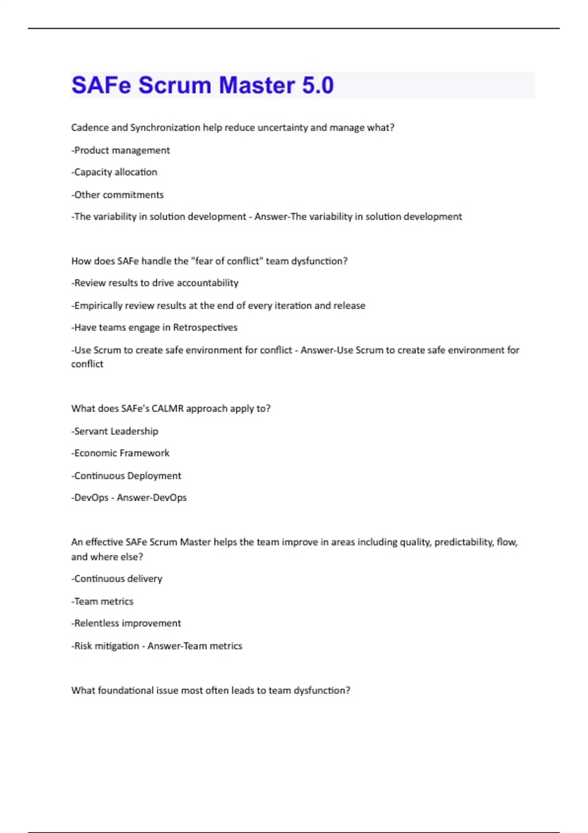 Cadence and Synchronization help reduce uncertainty and manage what? -Product management -Capacity allocation -Other commitments -The variability in solution development - Answer-The variability in solution development How does SAFe handle the "fear of conflict" team dysfunction? -Review results to drive accountability -Empirically review results at the end of every iteration and release -Have teams engage in Retrospectives -Use Scrum to create safe environment for conflict - Answer-Use Scrum to create safe environment for conflict What does SAFe's CALMR approach apply to? -Servant Leadership -Economic Framework -Continuous Deployment -DevOps - Answer-DevOps An effective SAFe Scrum Master helps the team improve in areas including quality, predictability, flow, and where else? -Continuous delivery -Team metrics -Relentless improvement -Risk mitigation - Answer-Team metrics What foundational issue most often leads to team dysfunction?-Weak Lean-Agile leadership -Avoidance of accountability -Lack of commitment -Absence of trust - Answer-Absence of trust What is an IP Iteration anti-pattern? -Identify opportunities for innovation spikes or hackathons -Identify infrastructure improvements -Plan work for the IP Iteration during PI Planning -Allow for cadence-based planning - Answer-Plan work for the IP Iteration during PI Planning An effective SAFe Scrum Master elevates people problems with strict confidence to the appropriate levels when necessary, but only after what has happened? -They have repeatedly directed the team member to take appropriate action -A team member consistently disagrees with the Scrum Master -The team consistently fails to meet consecutive PI goals -Coaching and internal processes have failed to achieve the objective - Answer-Coaching and internal processes have failed to achieve the objective What are two common anti-patterns during PI Planning? (Choose two.) -The Team Backlog is applied to a very targeted part of the organization -A detailed plan becomes the goal, rather than alignment -The team determines where changes should be targeted -Pressure is put on teams to overcommit - Answer-Pressure is put on teams to overcommit A detailed plan becomes the goal, rather than alignment How can a Scrum Master support a Problem-Solving Workshop? -By providing facilitation to breakout groups focused on specific problems -By estimating the work effort required to implement recommended improvements-By coaching the Release Train Engineer on managing the event -By acting as a process coach to the teams and providing the right answers - Answer-By providing facilitation to breakout groups focused on specific problems Why is a confidence vote held at the end of PI Planning? -To build shared commitment to the Program Plan -To hold the Teams accountable if the Agile Release Train does not deliver on its commitment -To remove the risks from the PI -To endure the Business Owners accept the Plan - Answer-To build shared commitment to the Program Plan What is a characteristic of an effective Scrum Master -Supports the autonomy of the team -Is a technical expert -Understands customer needs -Provides status - Answer-Supports the autonomy of the team The Scrum Master is what above all else? -A servant leader -The iteration owner -A SAFe Agilist -A team coach - Answer-A Servant Leader Becoming a coach requires a shift from old behaviors to new ones. What are the three examples of new coaching behaviors? (Choose two.) -Focus on business value delivery -Focus on deadlines -Facilitates team problem-solving -Ask the team for the answers -Fix problems for the team-Drive toward specific outcomes - Answer-Focus on business value delivery Facilitates team problem-solving Ask the team for the answers The Scrum Master role includes traditional Scrum team leadership and responsibilities to which other group? -To the business -To the Value Stream Engineers -To the teams take make up the Lean Portfolio -To the Agile teams at the Program Level - Answer-To the Agile teams at the Program Level What is accomplished in the first part of the PI Planning meeting? -Items are selected from the Program Backlog -The Scrum Master decides how much work can be accomplished -All tasks are defined -The Product Owner defines the iteration goal - Answer-Items are selected from the Program Backlog SAFe is based on three bodies of knowledge: Agile development, systems thinking, and what type of product development? -DevOps product development -Lean product development -Adaptive product development -Incremental product development - Answer-Lean product development What is one responsibility of a SAFe Scrum Master? -Coordinating with the Solution Architect and Solution Management -Maintaining the depth of the Architectural Runway -Prioritizing the work of the Systems Team -Facilitating an effective team breakout session - Answer-Facilitating an effective team breakout sessionWhat does transparency mean in a Scrum environment? -The team is constantly improving its process -The process is visible to all stakeholders -Team members must immediately share any and all feedback with each other -Development and Operations teams work together - Answer-The process is visible to all stakeholders The goal of Lean is to deliver the maximum customer value in the shortest sustainable lead time while providing what else? -Significant team contributions -The highest Possible quality -Improved Capacity allocation -A Continuous Delivery Pipeline - Answer-The highest Possible quality
