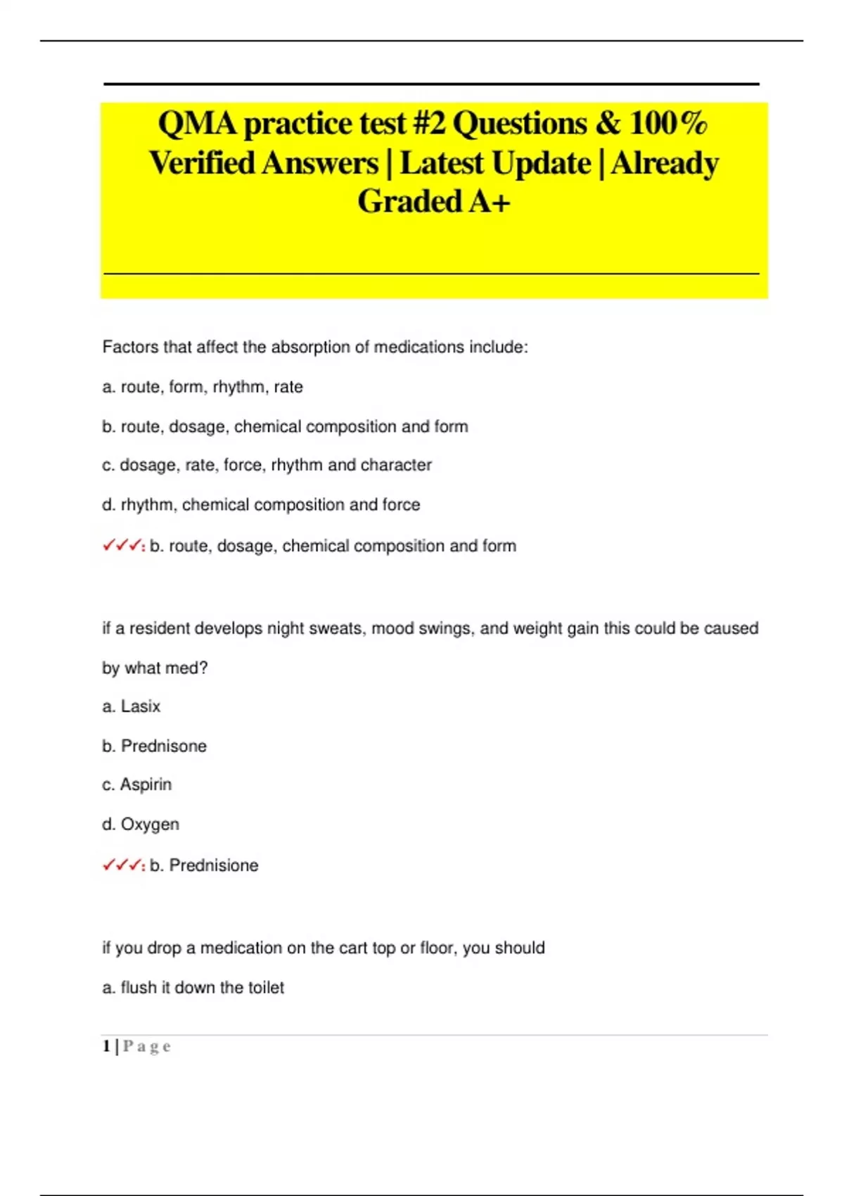 Factors that affect the absorption of medications include: a. route, form, rhythm, rate b. route, dosage, chemical composition and form c. dosage, rate, force, rhythm and character d. rhythm, chemical composition and force : b. route, dosage, chemical composition and form if a resident develops night sweats, mood swings, and weight gain this could be caused by what med? a. Lasix b. Prednisone c. Aspirin d. Oxygen : b. Prednisione if you drop a medication on the cart top or floor, you should a. flush it down the toilet 2 | P a g e b. dispose of it according to your facility policy c. dispose of it in the hazard waste box d. place the contaminated pill in the sharps container : b. dispose of it according to your facility policy if a medication is ordered daily at 9am, the acceptable time frame to administer this is: a. 8am-10am b. 7am-9am c. anytime during the shift d. none of the above : a. 8am-10am when you sign your name on an injury in the resident chart this indicated that you: a. assume the responsibility for this entry b. are in charge c. will re check your documentation later d. approve an MD order : a. assume the responsibility for this entry if the HOB is elevated 50 degrees, you are in a. lateral position b. sims position c. prone position 3 | P a g e d. fowler's position : d. fowler's position Rheumatoid Arthritis is a disease of: a. muscles b. joints c. blood d. heart : b. joint