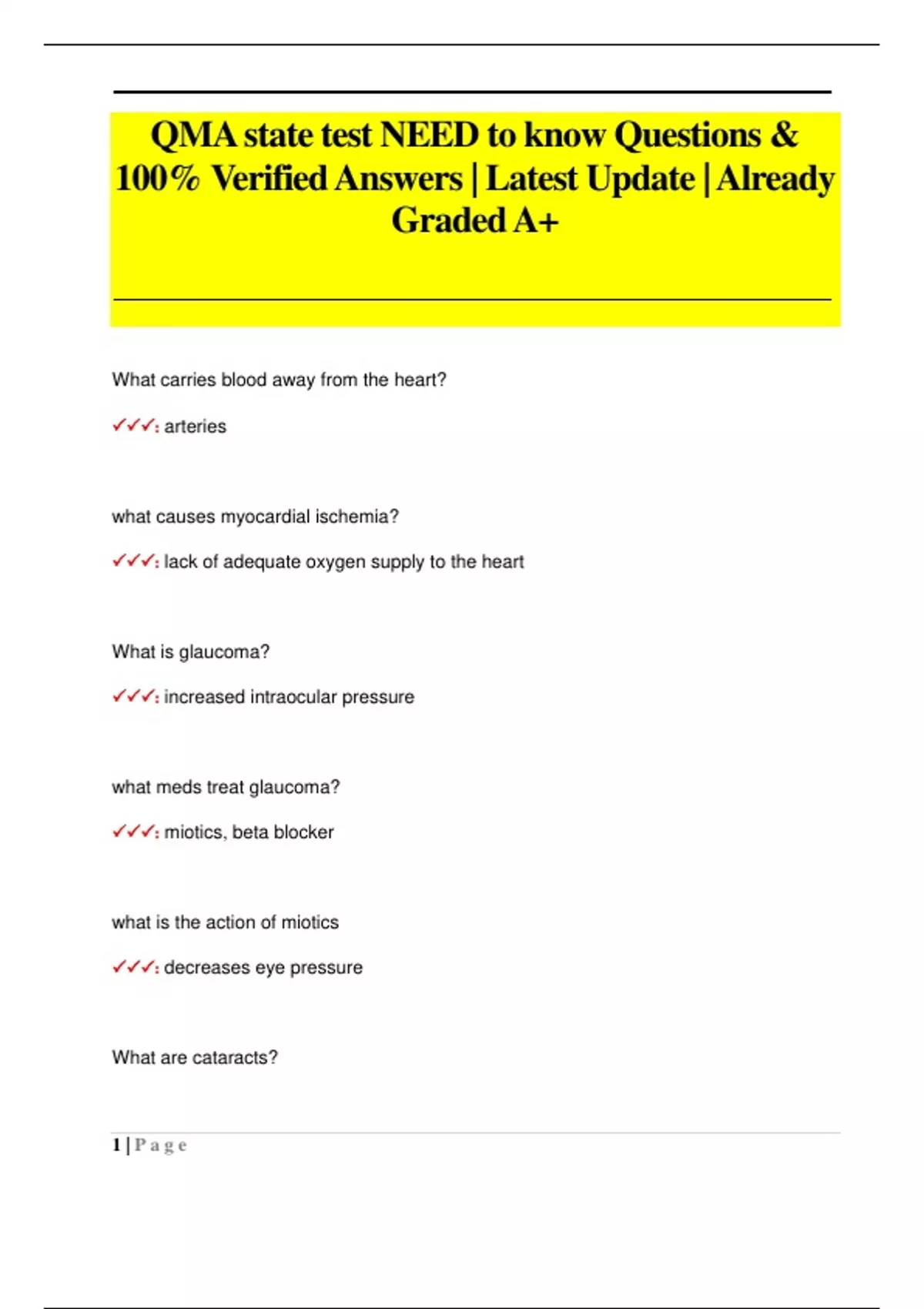 What carries blood away from the heart? : arteries what causes myocardial ischemia? : lack of adequate oxygen supply to the heart What is glaucoma? : increased intraocular pressure what meds treat glaucoma? : miotics, beta blocker what is the action of miotics : decreases eye pressure What are cataracts? 2 | P a g e : secondary infection, congenital disorder, reaction to medicafions or chemical toxicity what are symptoms of cataracts? : gradual blurring of vision, milky white pupil what is treatment of cataracts? : surgery, lens implantation, medications, or corrective glasses what medications treat cataracts : fluorometholone (FML), prednisolone (AK-Pred), diclofenac (voltaren) What is conjunctivitis? : inflammation of the conjunctiva what causes conjunctiva : irritation, allergies, bacteria symptoms of conjunctiviti