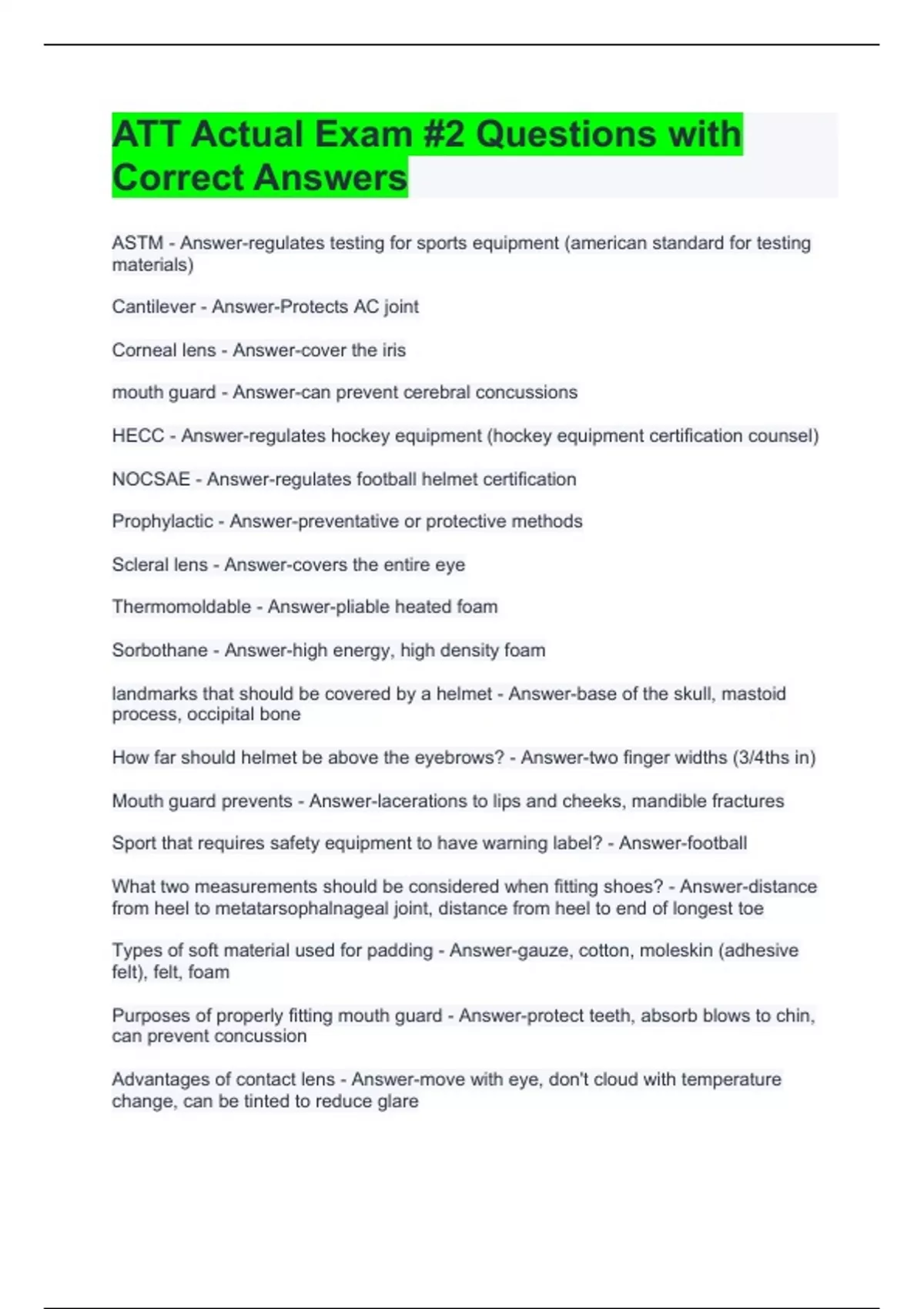 ASTM - Answer-regulates testing for sports equipment (american standard for testing materials) Cantilever - Answer-Protects AC joint Corneal lens - Answer-cover the iris mouth guard - Answer-can prevent cerebral concussions HECC - Answer-regulates hockey equipment (hockey equipment certification counsel) NOCSAE - Answer-regulates football helmet certification Prophylactic - Answer-preventative or protective methods Scleral lens - Answer-covers the entire eye Thermomoldable - Answer-pliable heated foam Sorbothane - Answer-high energy, high density foam landmarks that should be covered by a helmet - Answer-base of the skull, mastoid process, occipital bone How far should helmet be above the eyebrows? - Answer-two finger widths (3/4ths in) Mouth guard prevents - Answer-lacerations to lips and cheeks, mandible fractures Sport that requires safety equipment to have warning label? - Answer-football What two measurements should be considered when fitting shoes? - Answer-distance from heel to metatarsophalnageal joint, distance from heel to end of longest toe Types of soft material used for padding - Answer-gauze, cotton, moleskin (adhesive felt), felt, foam Purposes of properly fitting mouth guard - Answer-protect teeth, absorb blows to chin, can prevent concussion Advantages of contact lens - Answer-move with eye, don't cloud with temperature change, can be tinted to reduce glare