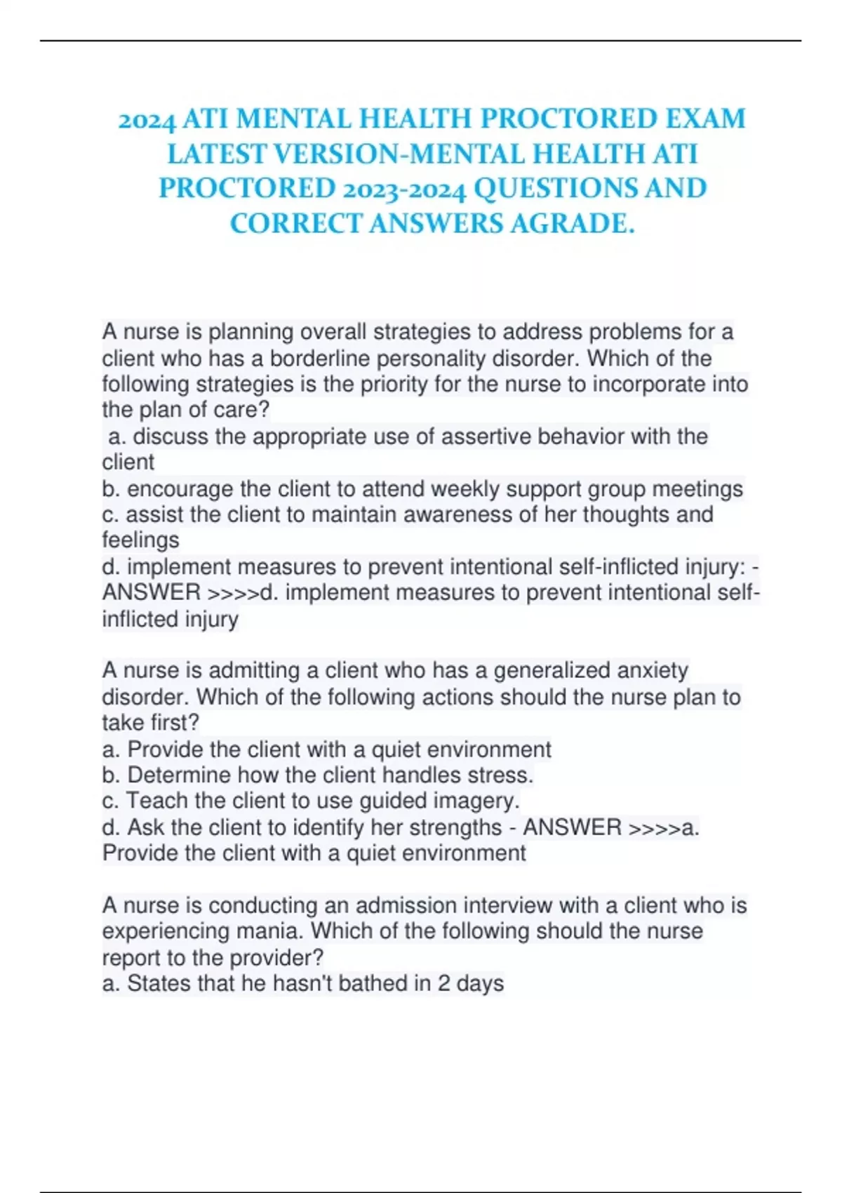 2024 ATI MENTAL HEALTH PROCTORED EXAM LATEST VERSION-MENTAL HEALTH ATI PROCTORED QUESTIONS AND CORRECT ANSWERS AGRADE.