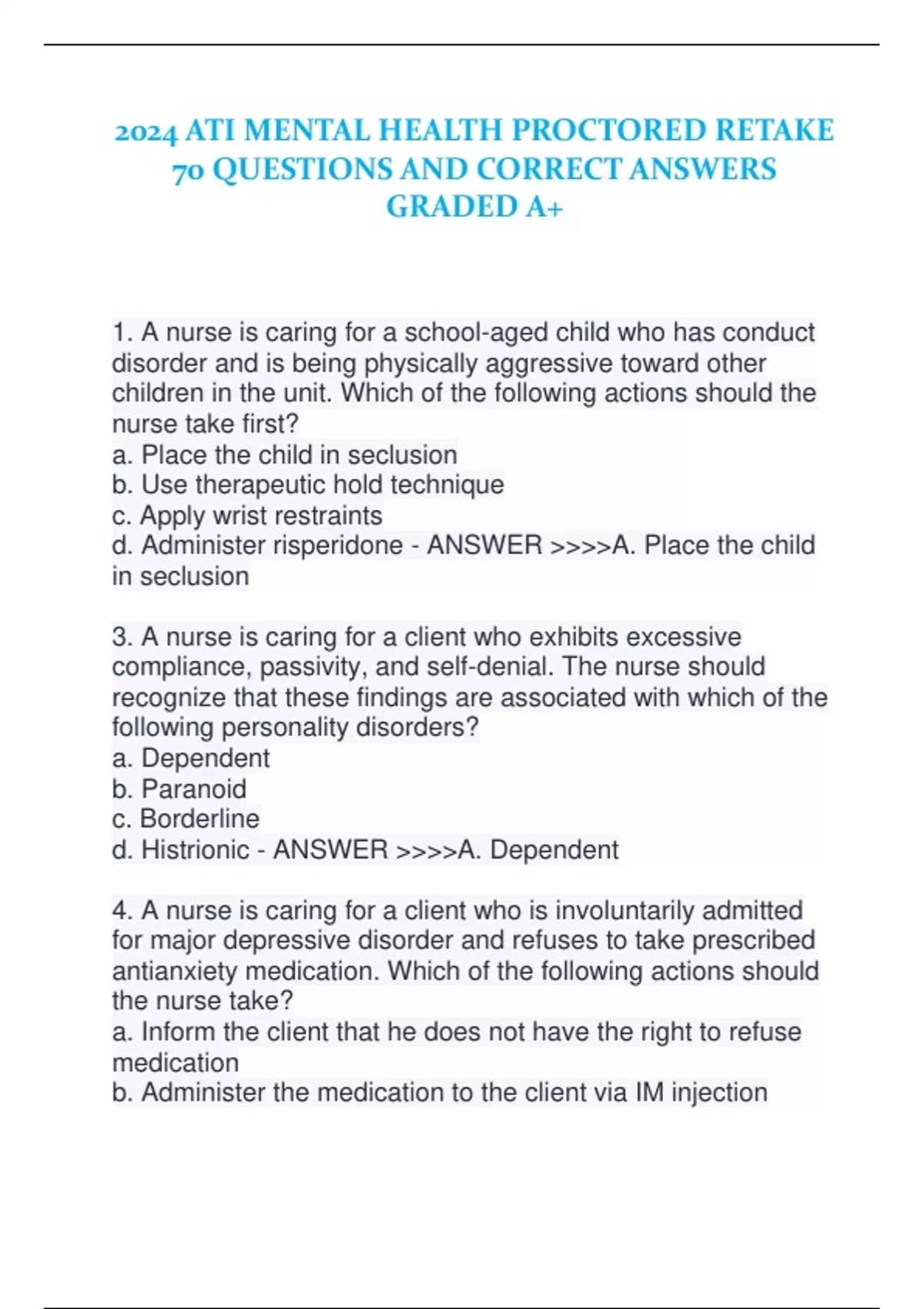 2024 ATI MENTAL HEALTH PROCTORED RETAKE 70 QUESTIONS AND CORRECT ANSWERS GRADED A+