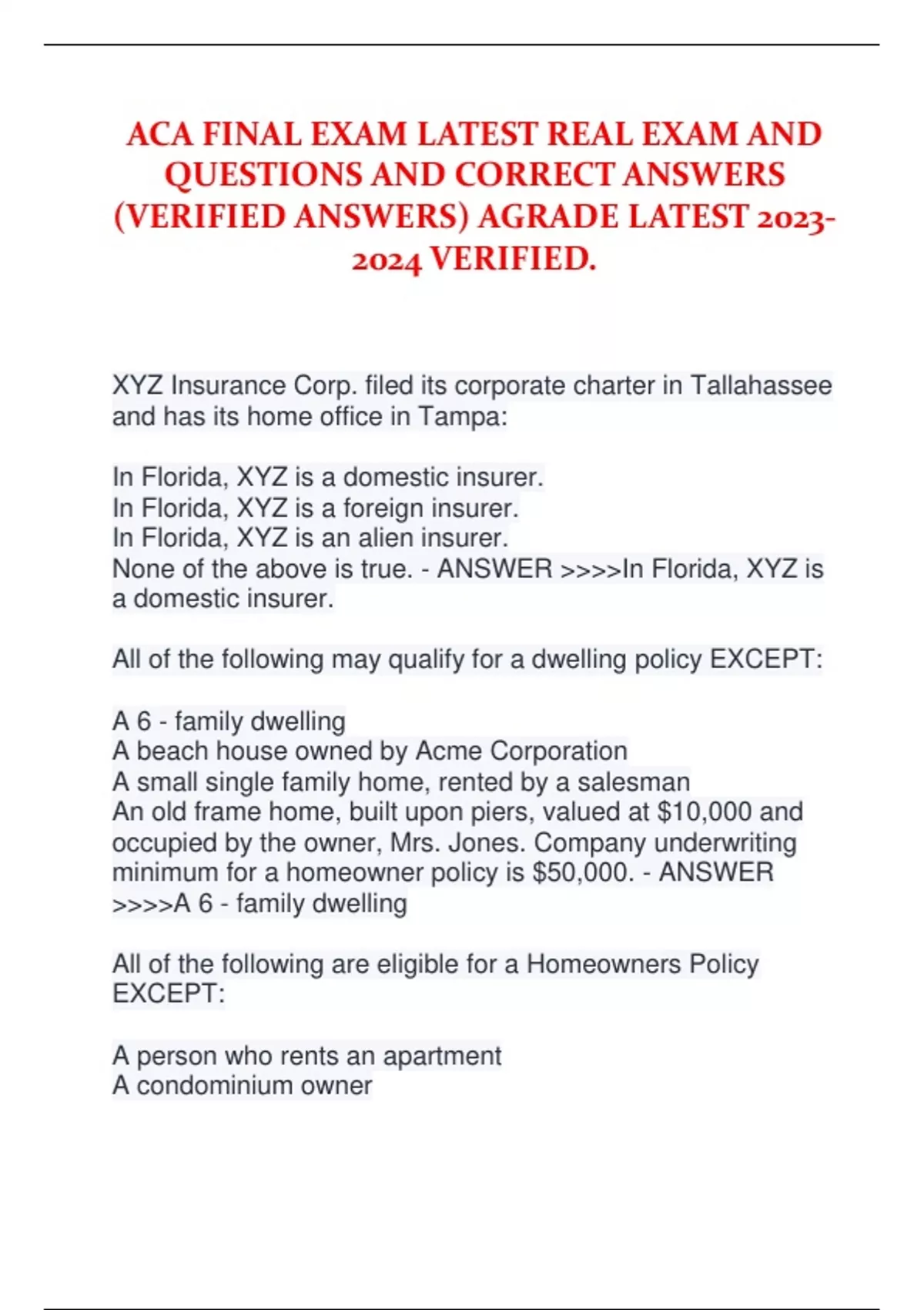 ACA FINAL EXAM LATEST REAL EXAM AND QUESTIONS AND CORRECT ANSWERS (VERIFIED ANSWERS) AGRADE LATEST 2023- 2024 VERIFIED