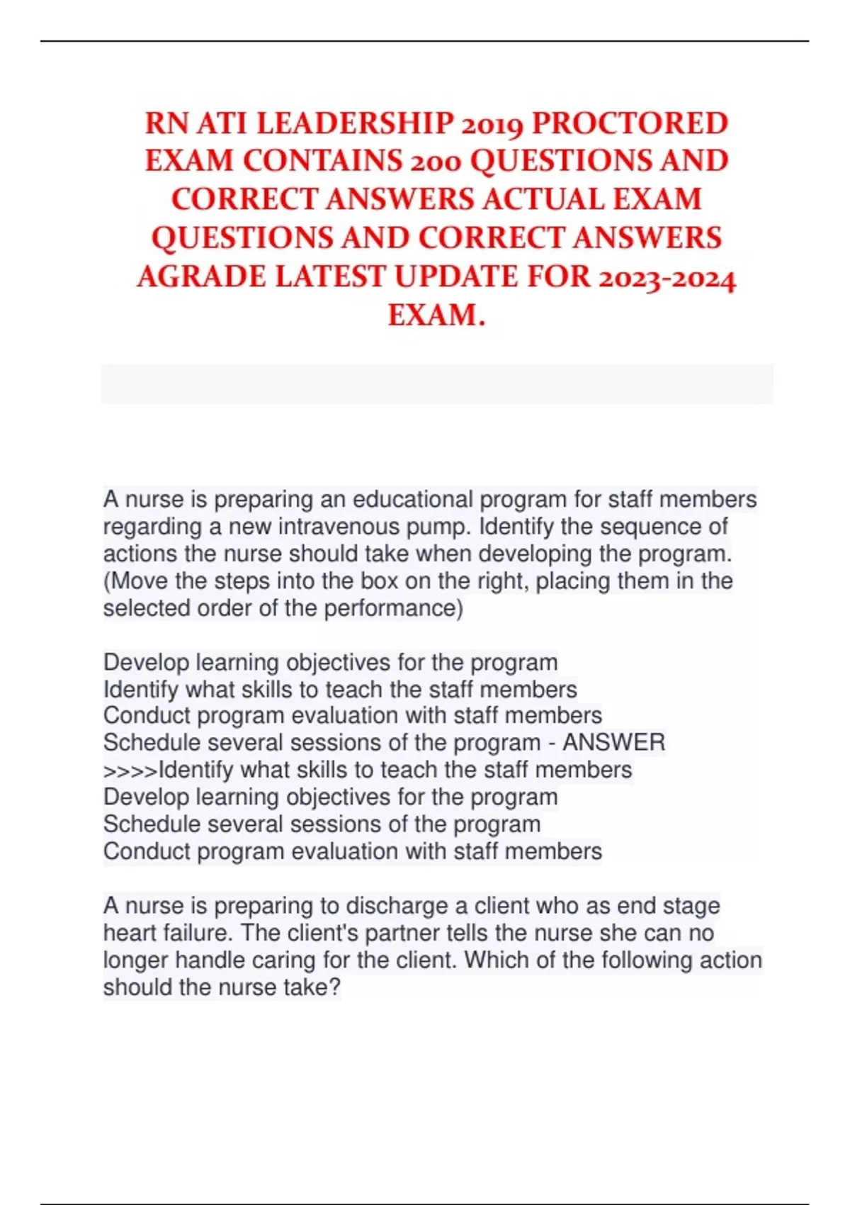 RN ATI LEADERSHIP 2019 PROCTORED EXAM CONTAINS 200 QUESTIONS AND CORRECT ANSWERS ACTUAL EXAM QUESTIONS AND CORRECT ANSWERS AGRADE LATEST UPDATE FOR EXAM
