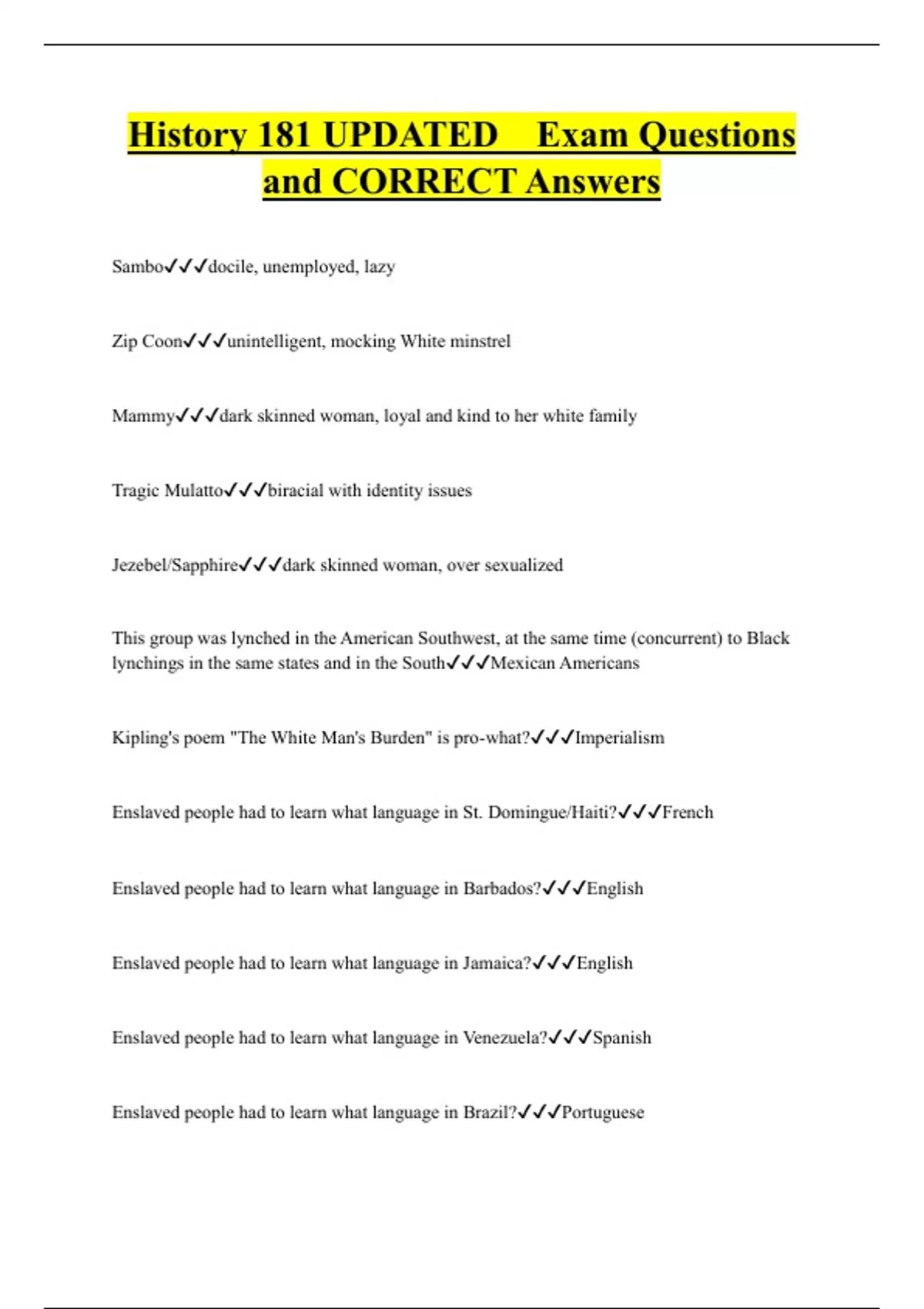 History 181 UPDATED Exam Questions and CORRECT Answers