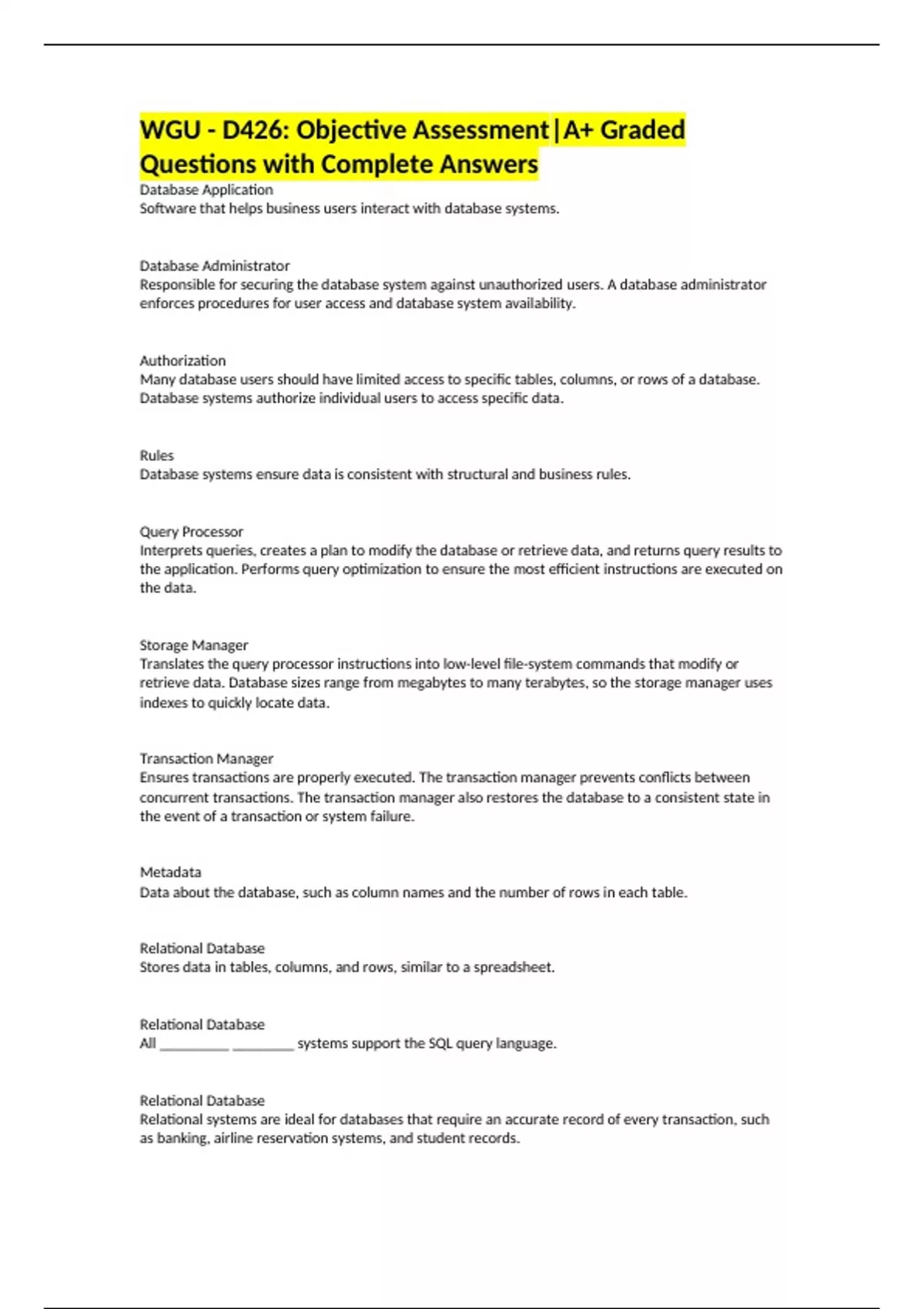 WGU - D426: Objective Assessment|A+ Graded Questions with Complete Answers Database Application Software that helps business users interact with database systems. Database Administrator Responsible for securing the database system against unauthorized users. A database administrator enforces procedures for user access and database system availability. Authorization Many database users should have limited access to specific tables, columns, or rows of a database. Database systems authorize individual users to access specific data. Rules Database systems ensure data is consistent with structural and business rules. Query Processor Interprets queries, creates a plan to modify the database or retrieve data, and returns query results to the application. Performs query optimization to ensure the most efficient instructions are executed on the data. Storage Manager Translates the query processor instructions into low-level file-system commands that modify or retrieve data. Database sizes range from megabytes to many terabytes, so the storage manager uses indexes to quickly locate data. Transaction Manager Ensures transactions are properly executed. The transaction manager prevents conflicts between concurrent transactions. The transaction manager also restores the database to a consistent state in the event of a transaction or system failure. Metadata Data about the database, such as column names and the number of rows in each table. Relational Database Stores data in tables, columns, and rows, similar to a spreadsheet. Relational Database All _________ ________ systems support the SQL query language. Relational Database Relational systems are ideal for databases that require an accurate record of every transaction, such as banking, airline reservation systems, and student records.