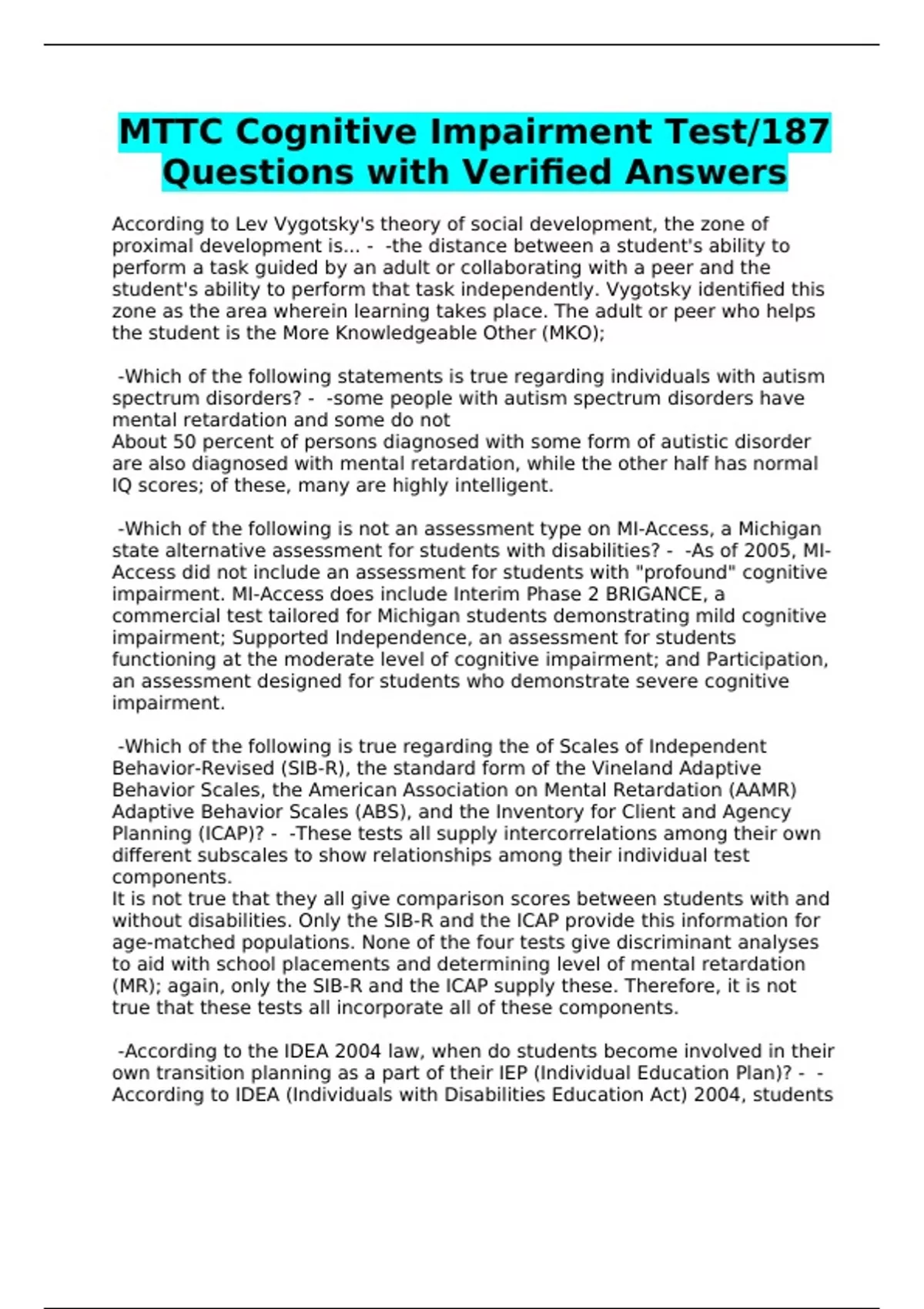 MTTC Cognitive Impairment Test/187 Questions with Verified Answers