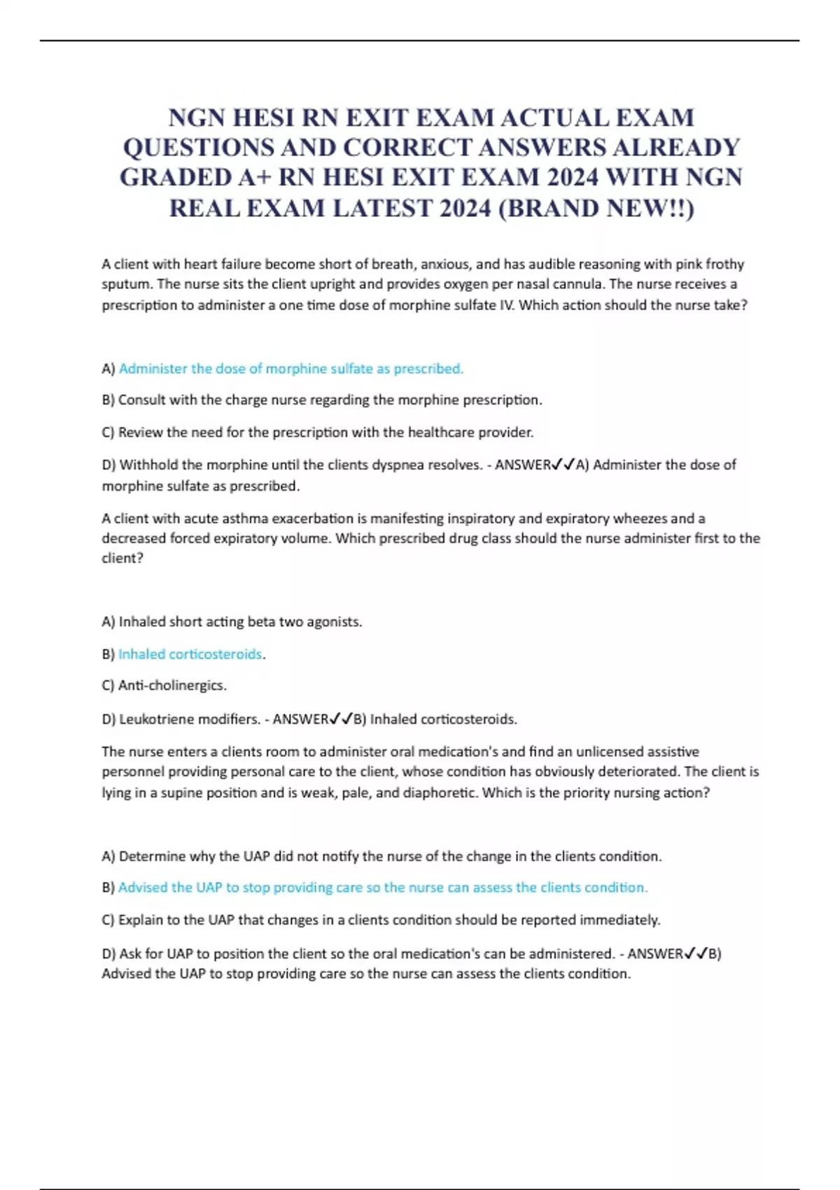 NGN HESI RN EXIT EXAM ACTUAL EXAM QUESTIONS AND CORRECT ANSWERS ALREADY GRADED A+ RN HESI EXIT EXAM 2024 WITH NGN REAL EXAM LATEST 2024 (BRAND NEW!!)