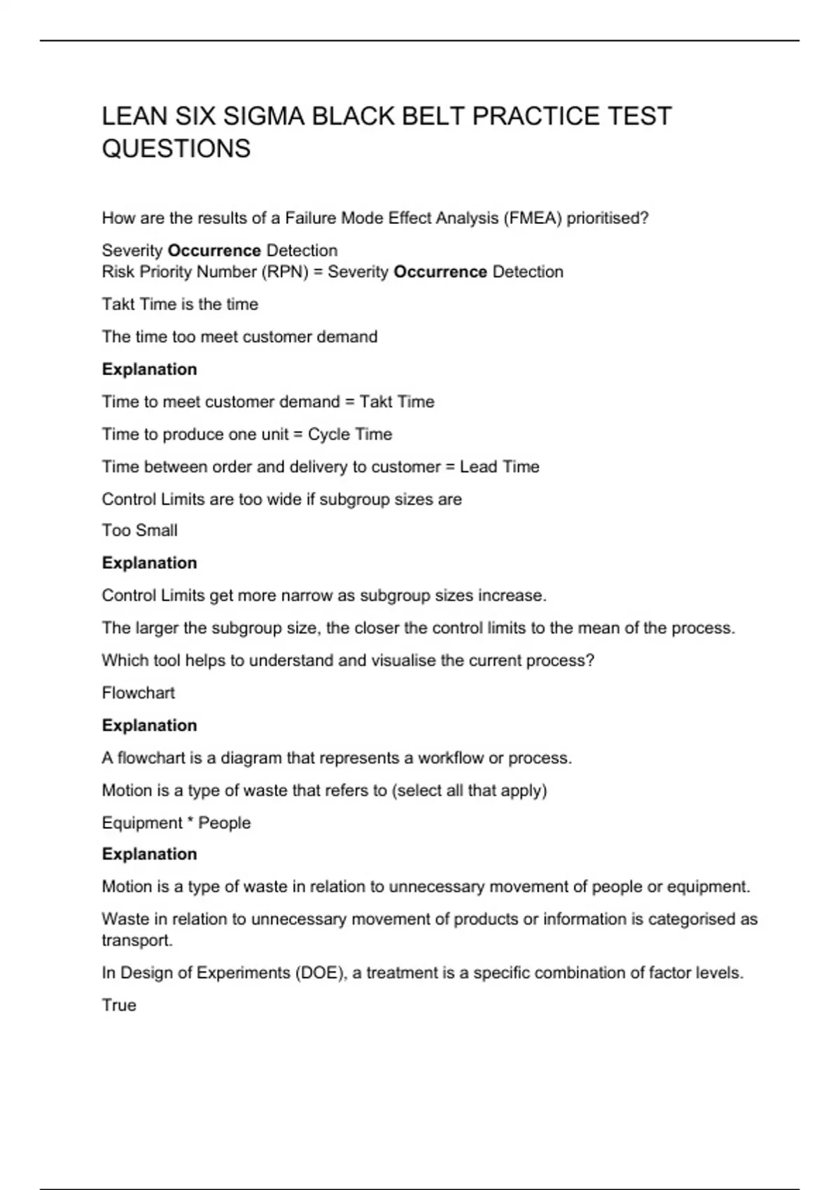 How are the results of a Failure Mode Effect Analysis (FMEA) prioritised? Severity Occurrence Detection Risk Priority Number (RPN) = Severity Occurrence Detection Takt Time is the time The time too meet customer demand Explanation Time to meet customer demand = Takt Time Time to produce one unit = Cycle Time Time between order and delivery to customer = Lead Time Control Limits are too wide if subgroup sizes are Too Small Explanation Control Limits get more narrow as subgroup sizes increase. The larger the subgroup size, the closer the control limits to the mean of the process. Which tool helps to understand and visualise the current process? Flowchart Explanation A flowchart is a diagram that represents a workflow or process. Motion is a type of waste that refers to (select all that apply) Equipment * People Explanation Motion is a type of waste in relation to unnecessary movement of people or equipment. Waste in relation to unnecessary movement of products or information is categorised as tr