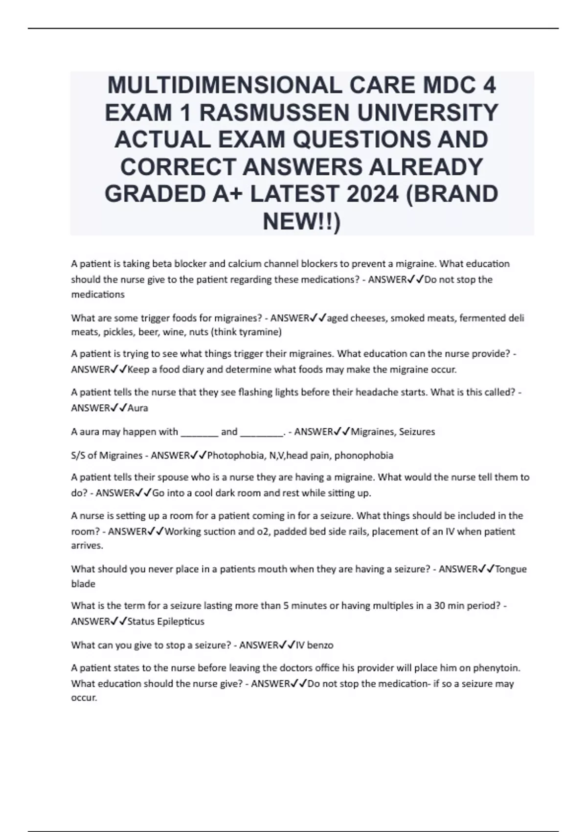 MULTIDIMENSIONAL CARE MDC 4 EXAM 1 RASMUSSEN UNIVERSITY ACTUAL EXAM QUESTIONS AND CORRECT ANSWERS ALREADY GRADED A+ LATEST 2024 (BRAND NEW!!)