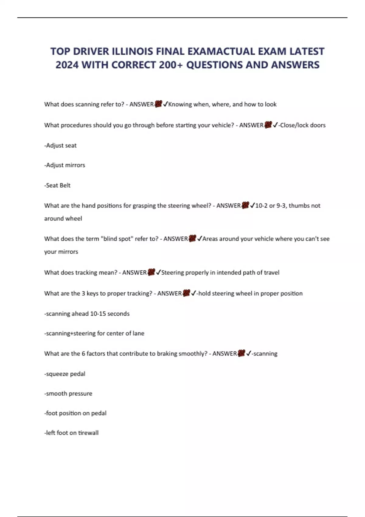 TOP DRIVER ILLINOIS FINAL EXAMACTUAL EXAM LATEST 2024 WITH CORRECT 200+ QUESTIONS AND ANSWERS