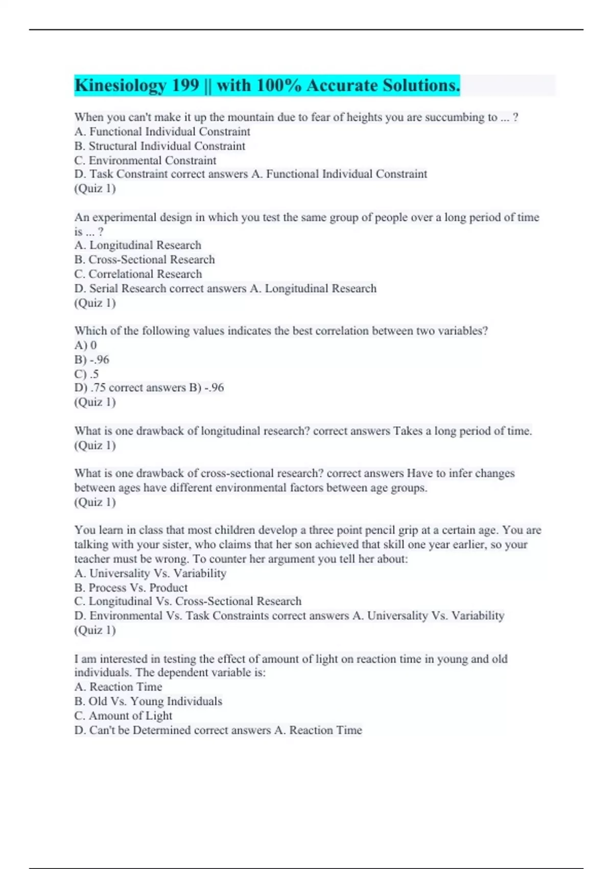When you can't make it up the mountain due to fear of heights you are succumbing to ... ? A. Functional Individual Constraint B. Structural Individual Constraint C. Environmental Constraint D. Task Constraint correct answers A. Functional Individual Constraint (Quiz 1) An experimental design in which you test the same group of people over a long period of time is ... ? A. Longitudinal Research B. Cross-Sectional Research C. Correlational Research D. Serial Research correct answers A. Longitudinal Research (Quiz 1) Which of the following values indicates the best correlation between two variables? A) 0 B) -.96 C) .5 D) .75 correct answers B) -.96 (Quiz 1) What is one drawback of longitudinal research? correct answers Takes a long period of time. (Quiz 1) What is one drawback of cross-sectional research? correct answers Have to infer changes between ages have different environmental factors between age groups. (Quiz 1) You learn in class that most children develop a three point pencil grip at a certain age. You are talking with your sister, who claims that her son achieved that skill one year earlier, so your teacher must be wrong. To counter her argument you tell her about: A. Universality Vs. Variability B. Process Vs. Product C. Longitudinal Vs. Cross-Sectional Research D. Environmental Vs. Task Constraints correct answers A. Universality Vs. Variability (Quiz 1) I am interested in testing the effect of amount of light on reaction time in young and old individuals. The dependent variable is: A. Reaction Time B. Old Vs. Young Individuals C. Amount of Light D. Can't be Determined correct answers A. Reaction Time