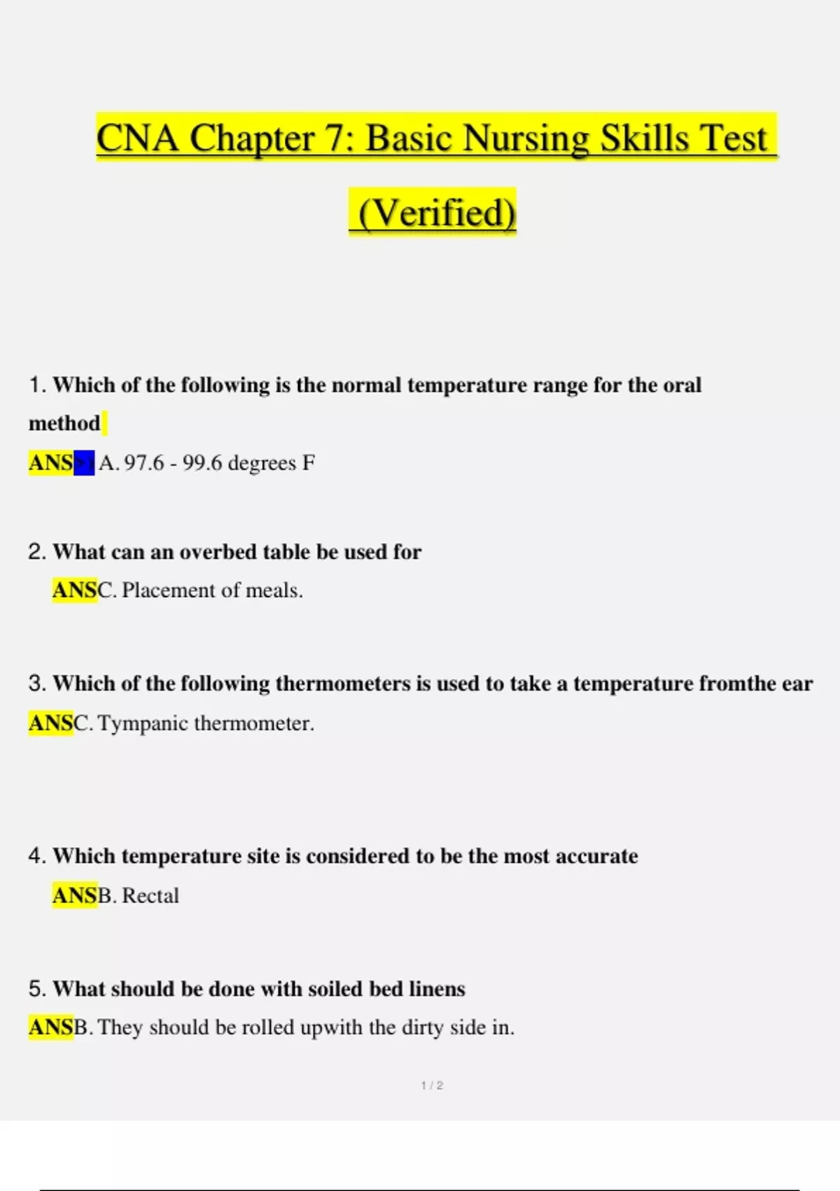 CNA Chapter 7 Basic Nursing Skills Test 2023– 2024(Verified) CNA Chapter 7 Basic Nursing Skills Test 2023– 2024(Verified) CNA Chapter 7: Basic Nursing Skills Test (Verified) 1. Which of the following is the normal temperature range for the oral method ANS>) A. 97.6 - 99.6 degrees F 2. What can an overbed table be used for ANSC. Placement of meals. 3. Which of the following thermometers is used to take a temperature from the ear ANSC. Tympanic thermometer. 4. Which temperature site is considered to be the most accurate ANSB. Rectal 5. What should be done with soiled bed linens ANSB. They should be rolled up with the dirty side in. 6. 6. Under which of the following conditions should a nursing assistant not take an oral temperature on a person ANSD. The person is confused or disoriented. 7. Where should the call light be placed when a nursing assistant leaves a resident's room ANSC. Within the resident's reach. 8. Which of the following should a nursing assistant do during a resident's admission ANSB. The NA should introduce the resident to other residents and staff members. 9. Which of the following statements is true of measuring rectal tempera- tures ANSC. The NA must hold onto the thermometer at all times while taking a rectal temperature. 10. The most common pulse that is used for measuring pulse rate is the: A. Radial pulse.
